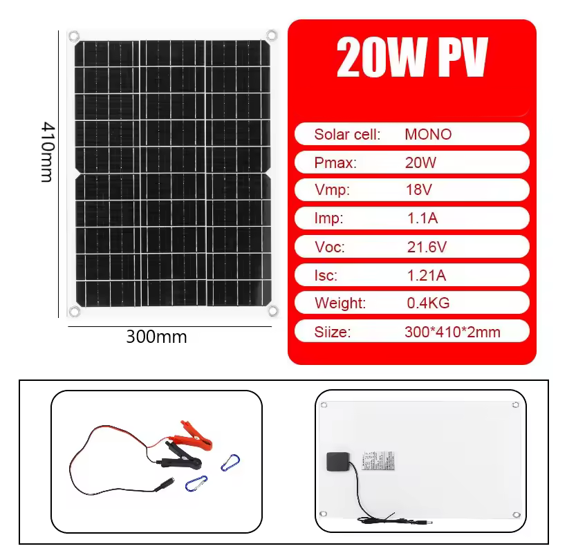 | Kapasitas Daya Optimal Dengan daya 20 W, solar panel ini cocok digunakan untuk berbagai aplikasi, termasuk pengisian daya baterai, pencahayaan luar ruangan, atau sebagai sumber daya cadangan untuk peralatan listrik kecil. Jadi Anda bisa memasang perangkat elektronik di luar rumah dengan sumber daya yang mudah dan lebih ramah lingkungan. |