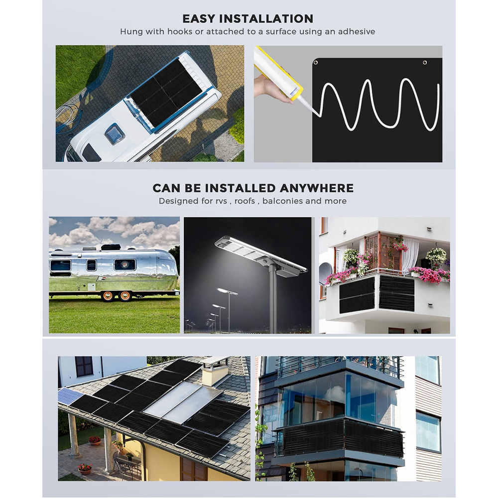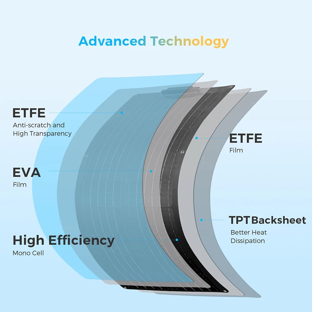 | Anti Gores & Transparansi Tinggi Permukaan panel menggunakan ETFE film berkualitas tinggi yang memiliki transparansi sangat baik untuk memaksimalkan penyerapan cahaya matahari. Material ETFE juga terkenal tahan gores, tahan cuaca ekstrem, dan lebih awet dibanding lapisan plastik biasa, menjadikannya cocok untuk penggunaan jangka panjang di luar ruangan. |