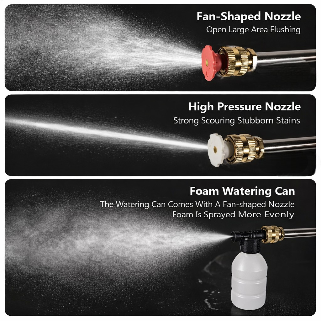 | Berbagai Jenis Nozzle Sesuaikan efek semprot dengan kebutuhan. Anda hanya perlu memasang nozzle yang tepat untuk mengubah sudut pancaran semprot yang dihasilkan. Anda bisa menggunakan nozzle lurus, nozzle fan atau kipas, hingga nozzle foam atau busa. |