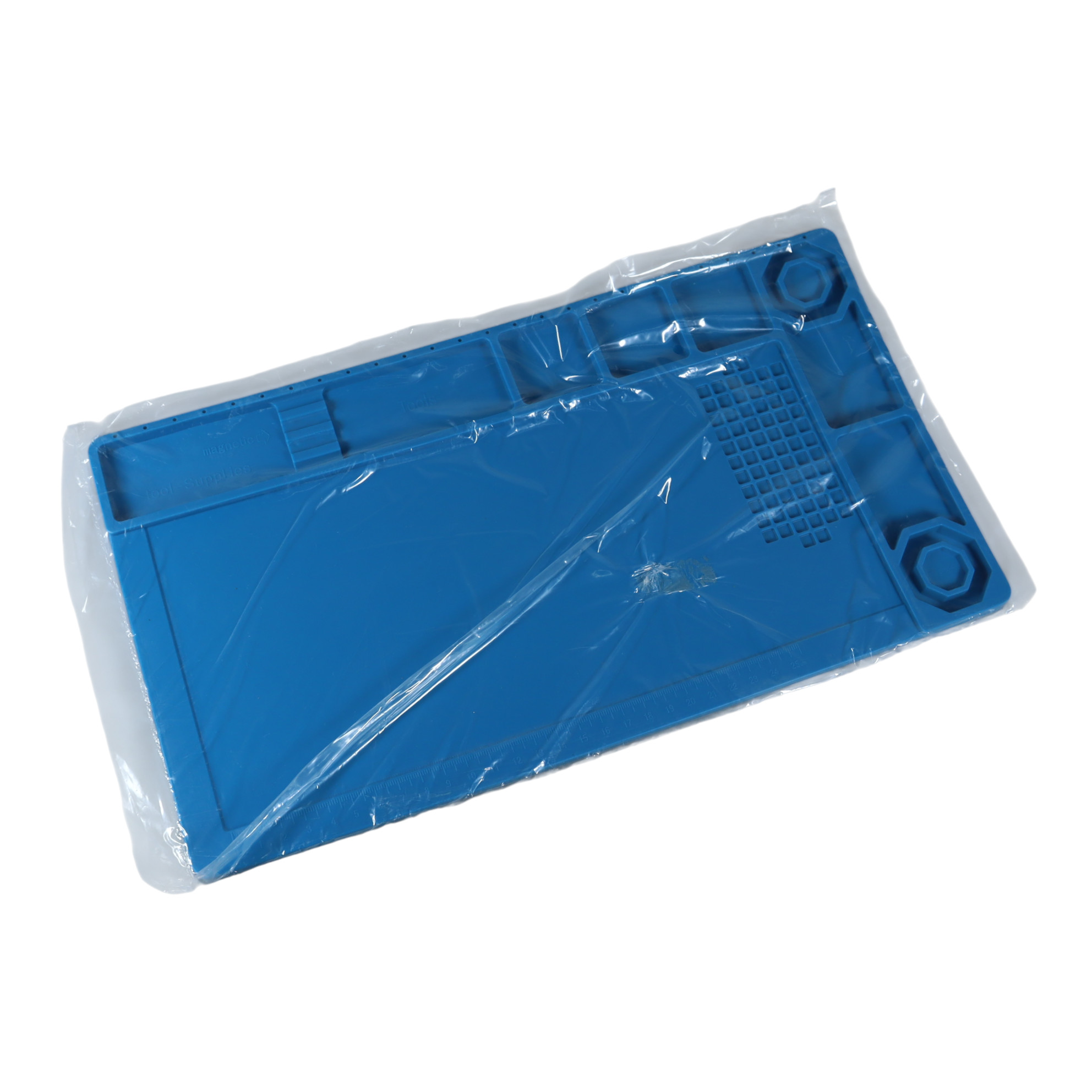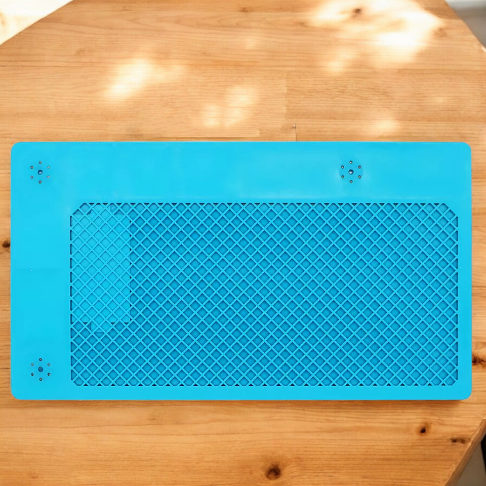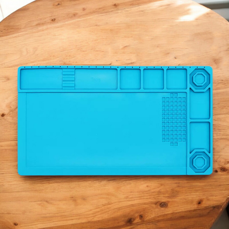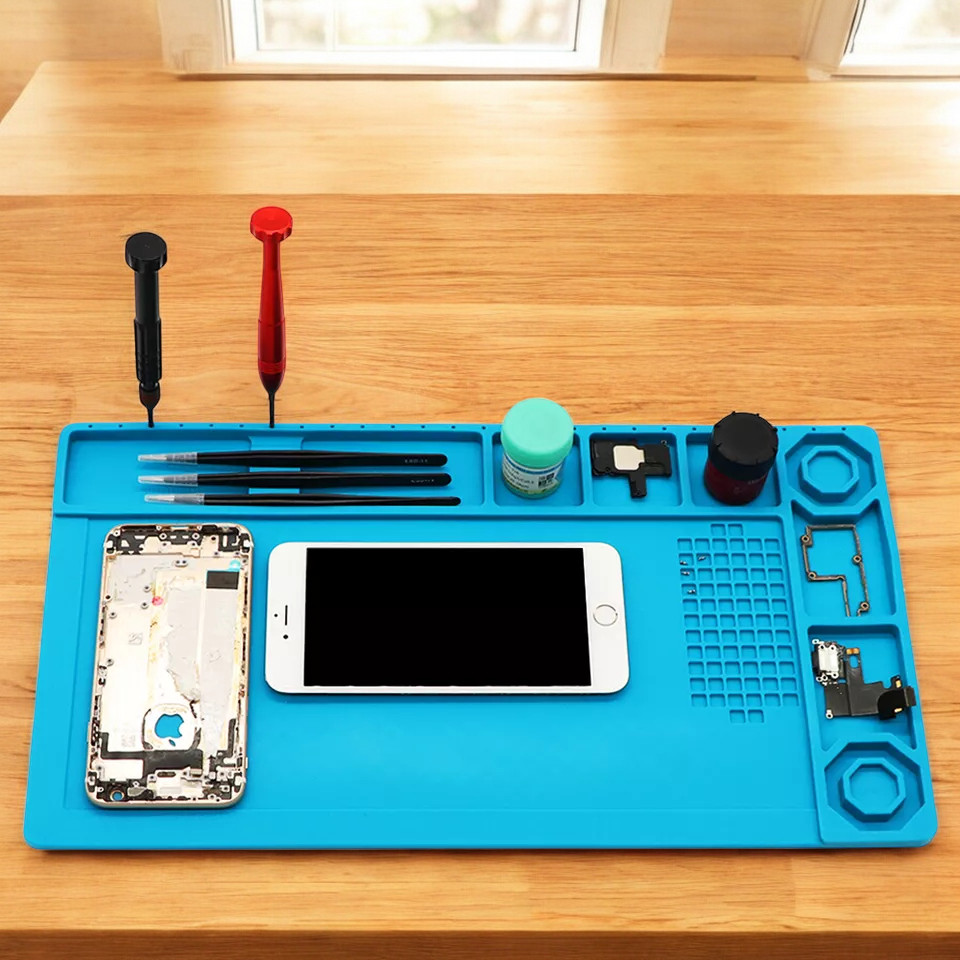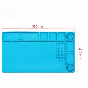 | Material Karet Silikon Mat ini terbuat dari karet silikon yang mampu menahan suhu sangat tinggi, hingga sekitar 500°C. Dengan kemampuan ini, Anda bisa meletakkan solder, hot air gun atau perangkat yang memancarkan panas langsung di atas alas kerja tanpa takut meja kerja atau permukaan lain rusak akibat panas. Ini sangat berguna untuk pekerjaan servis elektronik yang intensif. |