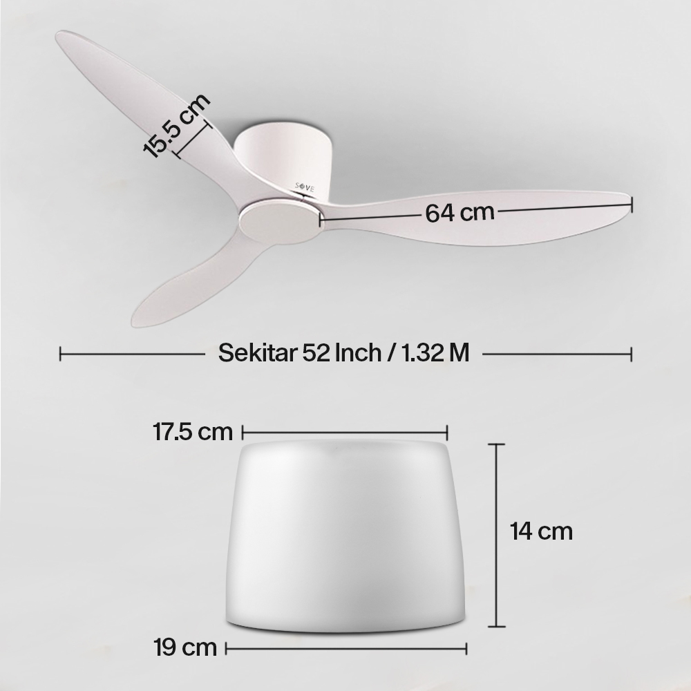 Lebar Total: Sekitar 52 Inch / 1.32 M Bilah Kipas: 64 x 15.5 cm Housing Motor: - Diameter Atas: 17.5 cm - Diameter Bawah: 19 cm - Tinggi: 14 cm