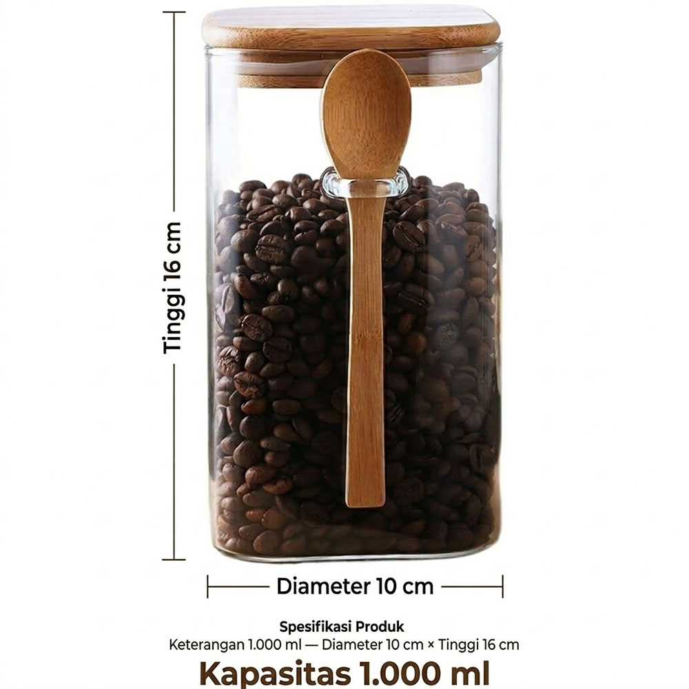 Toples kaca borosilikat kotak premium yang hadir dengan sendok kayu elegan. Dirancang dengan desain persegi yang efisien dalam ruang penyimpanan, stoples ini sempurna untuk menyimpan biji kopi, teh, biji-bijian, rempah-rempah, hingga camilan. Terbuat dari kaca borosilikat berkualitas tinggi yang transparan, bebas bahan kimia berbahaya, serta tahan terhadap perubahan suhu. Tersedia dalam tiga pilihan kapasitas untuk memenuhi berbagai kebutuhan dapur dan meja bar Anda.