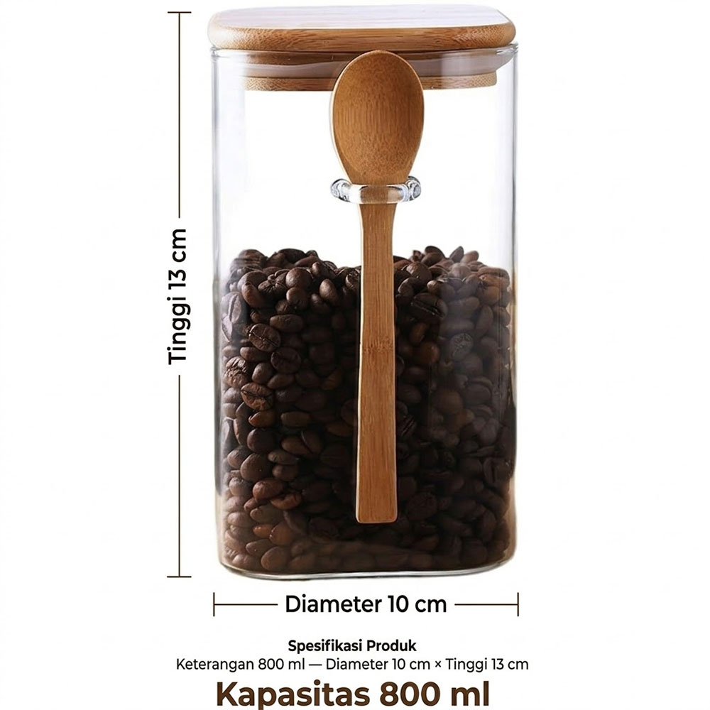 Setiap stoples dilengkapi sendok kayu natural yang berfungsi sebagai alat takar atau pengambil isi yang higienis. Kayu merupakan material alami yang tidak bereaksi dengan bahan makanan, tidak menimbulkan bau asing, serta menambahkan sentuhan estetika alami yang hangat pada penampilan stoples secara keseluruhan.