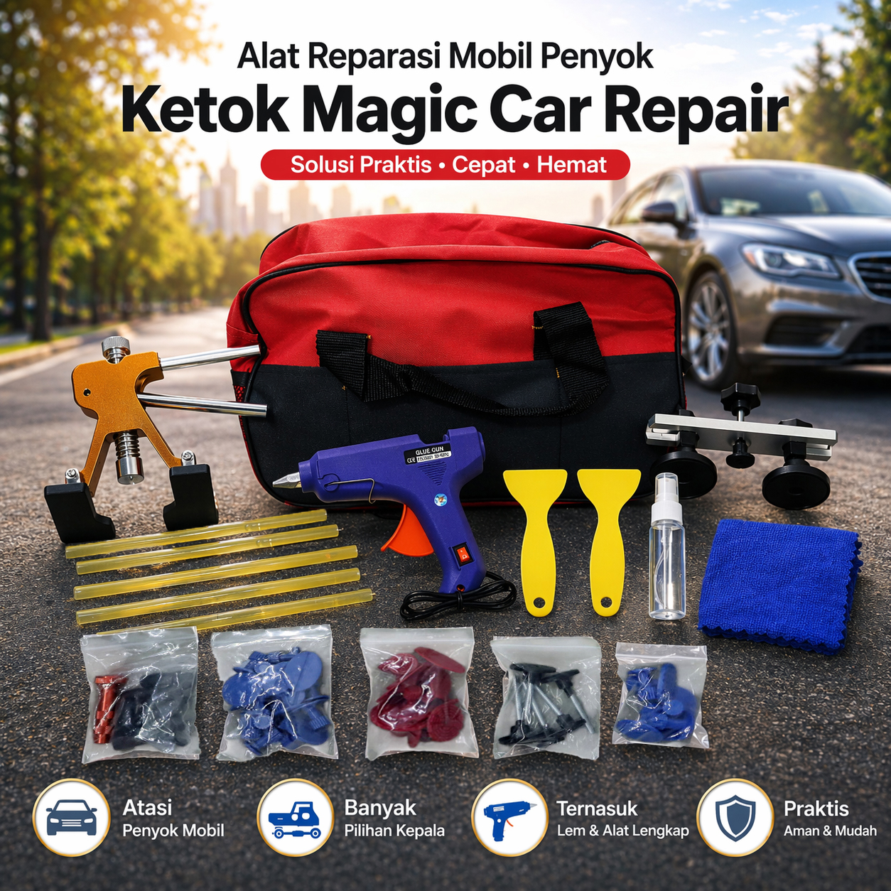 Set reparasi mobil ini berfungsi untuk memperbaiki pintu atau bodi mobil Anda yang rusak atau penyok, sekaligus tetap menjaga dan melindungi cat mobil Anda dengan sempurna. Hadir dengan set peralatan yang lengkap serta dilengkapi dengan tas penyimpanan sehingga Anda dapat membawanya dengan mudah saat dibutuhkan.