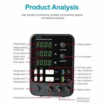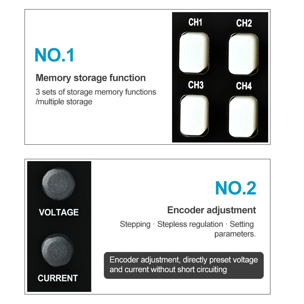 | 4 Set Fungsi Penyimpanan Anda bisa menyimpan hingga 4 pengaturan voltase dan arus yang berbeda. Jadi, jika Anda sering menggunakan pengaturan yang sama untuk memperbaiki HP, laptop, atau alat elektronik lain, Anda bisa langsung menggunakan preset-nya tanpa harus melakukan pengaturan ulang. |