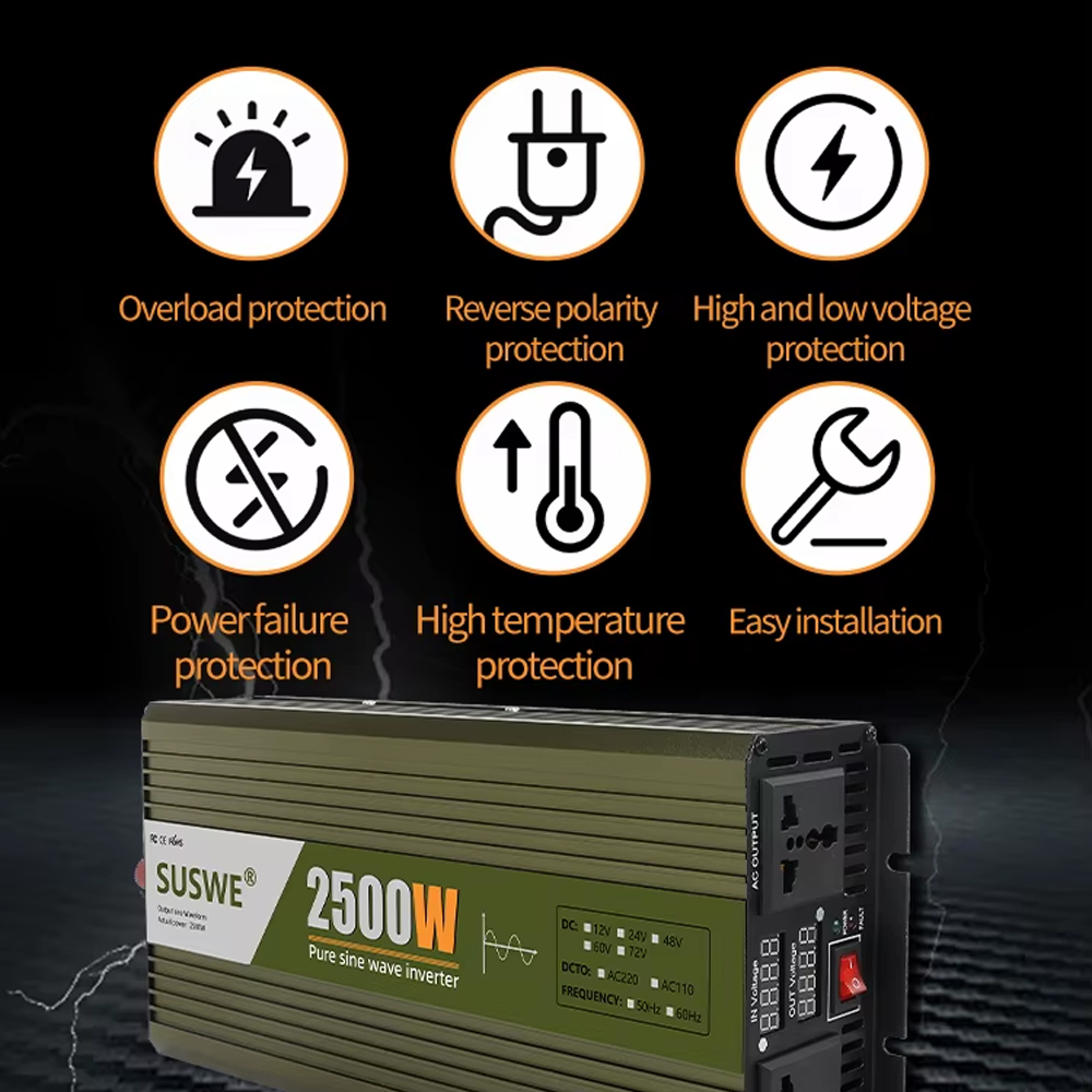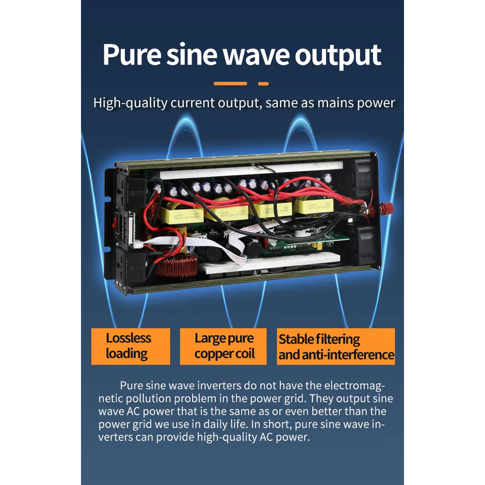 | Inverter Berjenis Pure Sine Wave Power inverter ini mampu menyuplai arus listrik yang dibutuhkan peralatan elektronik karena menggunakan gelombang sinus. Jenis yang diadopsi adalah pure sine wave dengan bentuk gelombang yang halus dan ideal, mirip dengan gelombang listrik di rumah Anda. |