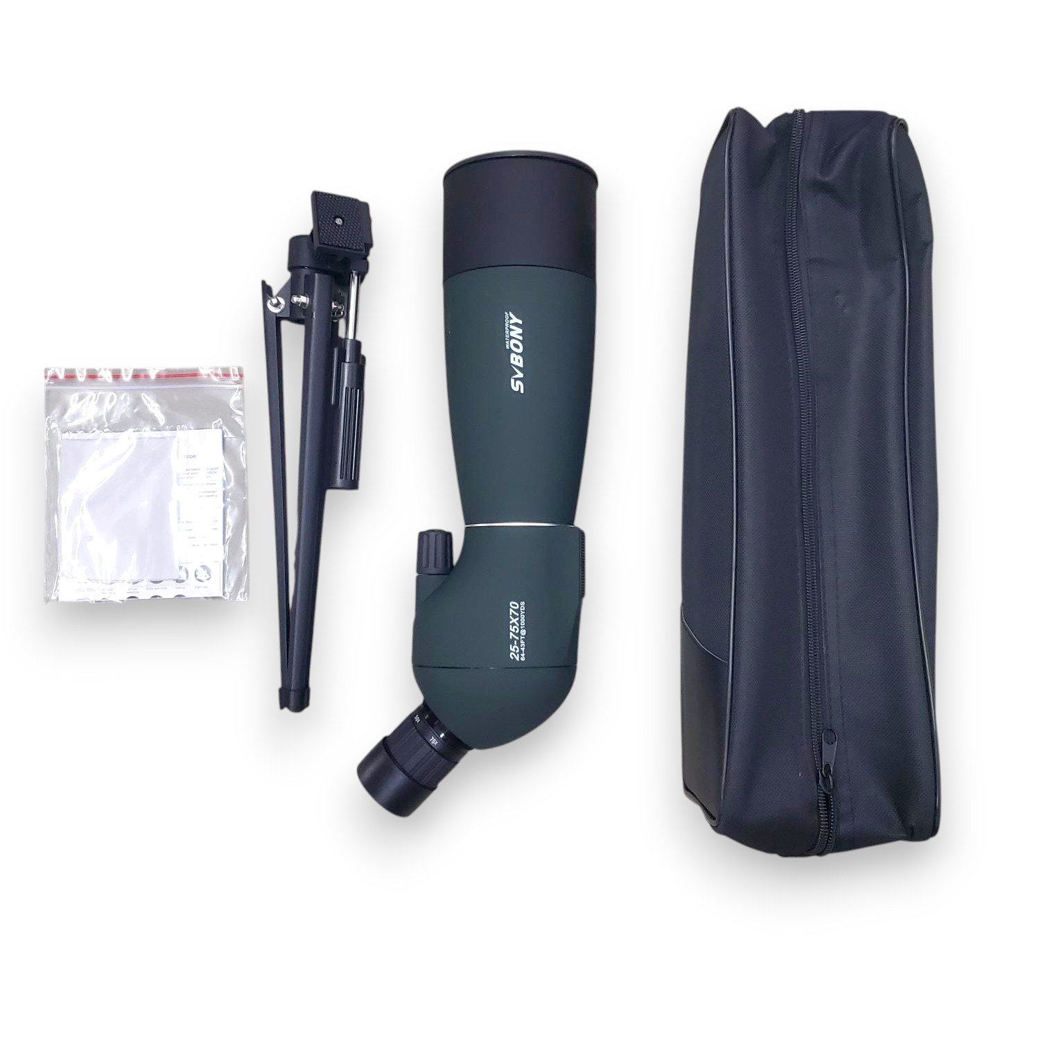 Nikmati pengalaman observasi yang jernih menggunakan teleskop spotting dari SVBONY. Dilengkapi dengan pembesaran hingga 75X, lensa BAK4 dengan lapisan FMC, dan eyepiece besar yang nyaman. Spotting bisa lebih mudah dengan tripod stabil untuk observasi bebas goyangan. Observasi di berbagai kondisi cuaca pun tidak akan masalah karena tahan anti dan anti embun.