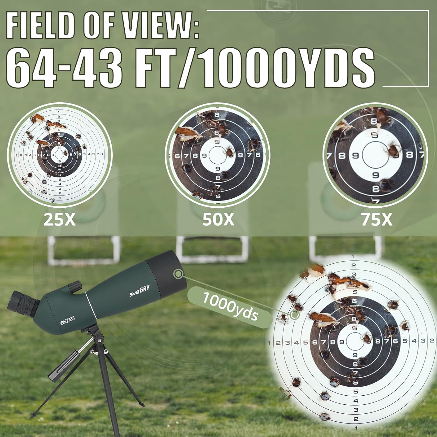 Nikmati pengalaman observasi yang jernih menggunakan teleskop spotting dari SVBONY. Dilengkapi dengan pembesaran hingga 75X, lensa BAK4 dengan lapisan FMC, dan eyepiece besar yang nyaman. Spotting bisa lebih mudah dengan tripod stabil untuk observasi bebas goyangan. Menangkap momen melalui ponsel juga mudah berkat hadirnya phone holder. Observasi di berbagai kondisi cuaca pun tidak akan masalah karena tahan anti dan anti embun.