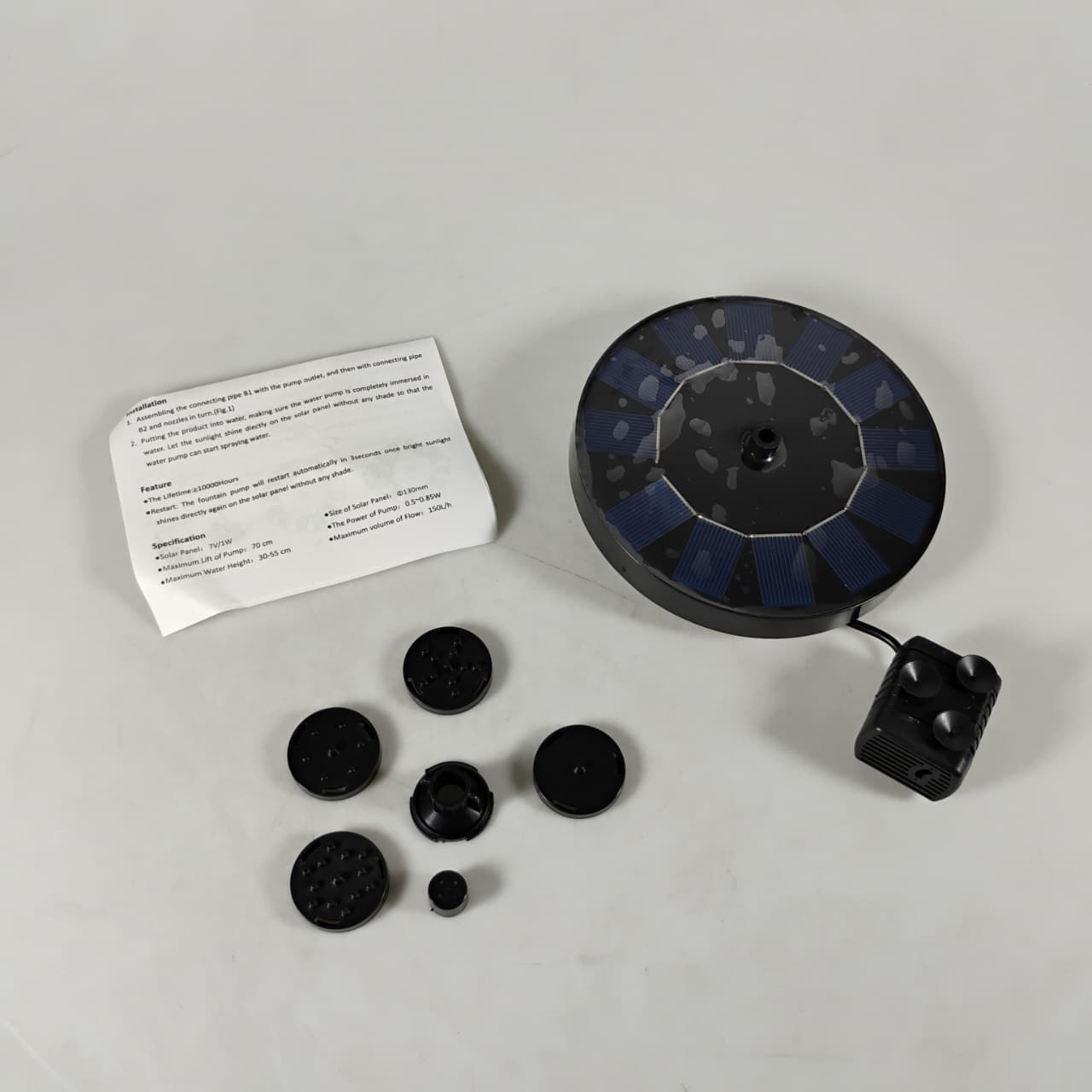| Panel Surya Air mancur ini menggunakan tenaga baterai yang dapat diisi ulang menggunakan tenaga sinar matahari karena alat ini memiliki panel surya. Hal tersebut membuat air mancur sangat cocok digunakan pada kolam ikan luar ruangan. |