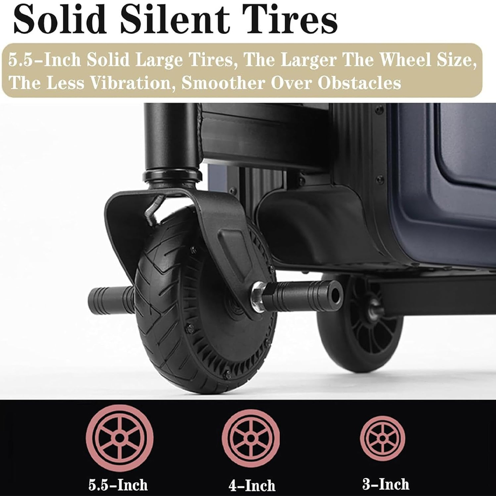 Koper skuter yang satu ini bisa berjalan dengan aman berkat ban anti slip dan foot rest. Ban berukuran 5.5 Inch yang anti slip ini cocok digunakan di jalur datar, misalnya lantai bandara. Anda juga bisa meletakkan kaki dengan nyaman pada foot rest di bagian kanan dan kiri koper. Pedal gas dari bahan karet menjamin kenyamanan tangan agar tidak slip saat Anda kendarai.