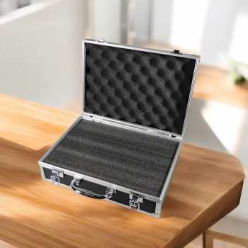 Kotak penyimpanan kokoh dengan desain sederhana, terbuat dari aluminium dan plastik tahan debu serta air. Dua klip pengunci menjaga isi tetap aman. Bagian dalam dilapisi busa tebal yang melindungi barang elektronik atau lensa kamera dari lecet dan benturan, menjadikannya pilihan praktis dan terpercaya.