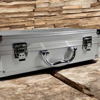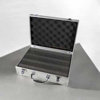 Kotak penyimpanan kokoh dengan desain sederhana, terbuat dari aluminium dan plastik tahan debu serta air. Dua klip pengunci menjaga isi tetap aman. Bagian dalam dilapisi busa tebal yang melindungi barang elektronik atau lensa kamera dari lecet dan benturan, menjadikannya pilihan praktis dan terpercaya.
