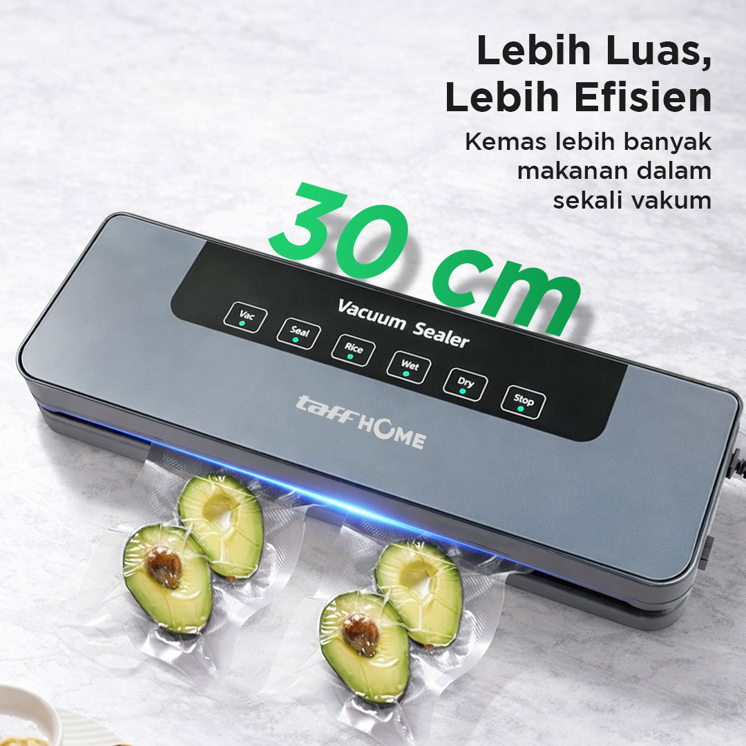 | Lebih Luas, Lebih Efisien Area sealer dengan lebar 30 cm membuat Anda dapat mengemas lebih banyak makanan dalam sekali vakum. Cocok untuk penggunaan sehari-hari hingga bisnis kecil. |