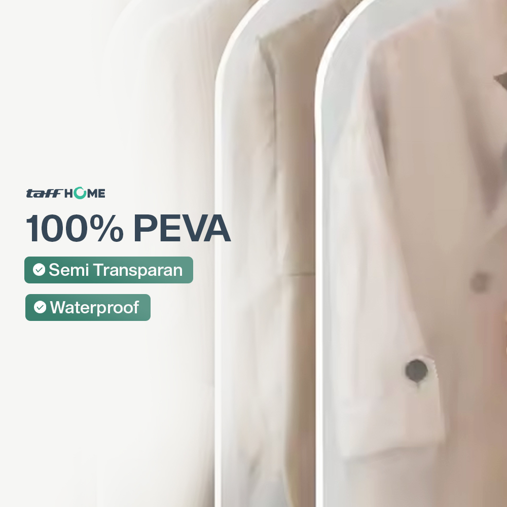 | PEVA Berkualitas Bahan PEVA yang digunakan semi transparan untuk memudahkan Anda mengetahui baju apa saja yang disimpan di dalamnya. Bahan ini juga waterproof sehingga pakaian tetap kering dan bebas lembap. |