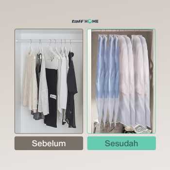 Lindungi pakaian dari debu dan kotoran saat di simpan menggunakan cover pakaian dari TaffHOME. Dapat melindungi pakaian dari semua sisi, cover ini cocok untuk menyimpan pakaian spesial yang jarang dipakai. Hadir dengan ukuran universal yang bisa digunakan untuk menyimpan aneka jenis pakaian. Pakaian tetap bersih dan rapi meski disimpan dalam jangka lama.