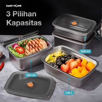 Kotak makan TaffHOME hadir dengan banyak pilihan ukuran, yaitu 928 ml, 950 ml, dan 1.66 L yang memudahkan Anda memilih kapasitas sesuai kebutuhan.