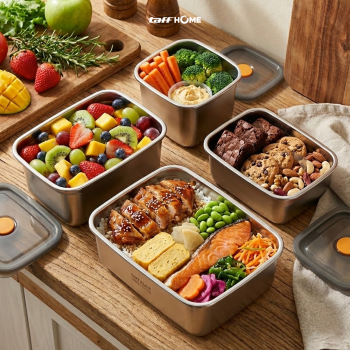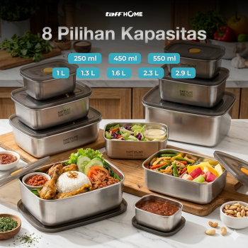 Bawa bekal lebih praktis, dan higienis dengan TaffHOME kotak makan multifungsi. Terbuat dari Stainless Steel 304, silikon, dan PP yang anti karat dan tahan suhu tinggi sehingga aman untuk makanan. Pilihan kapasitas 250 ml hingga 2.9 L cocok untuk bawa nasi, lauk, buah, hingga sayur sehari-hari.