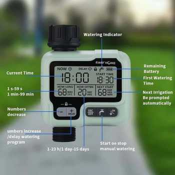 | Layar dan Tombol Intuitif Dilengkapi dengan layar LCD yang informatif dan tombol intuitif. Bagian layar menunjukkan waktu real time, waktu mulai penyiraman, lama penyiraman, seberapa sering penyiraman, penyiraman selanjutnya, hingga kapasitas baterai. Tombolnya juga dilengkapi dengan logo yang jelas untuk memudahkan Anda melakukan pengaturan. Anda hanya perlu menekan tombol dan melakukan setting waktu di layar untuk menggunakannya. |