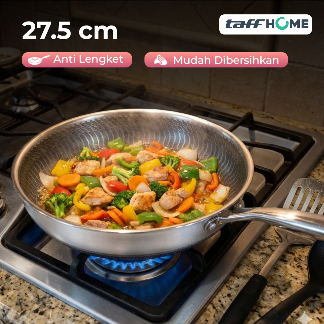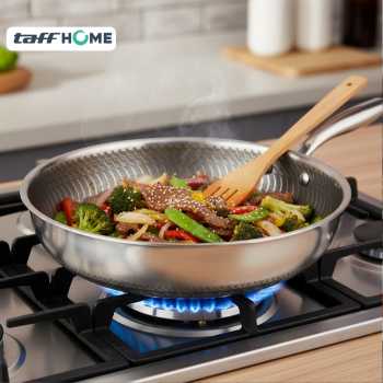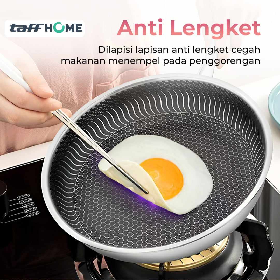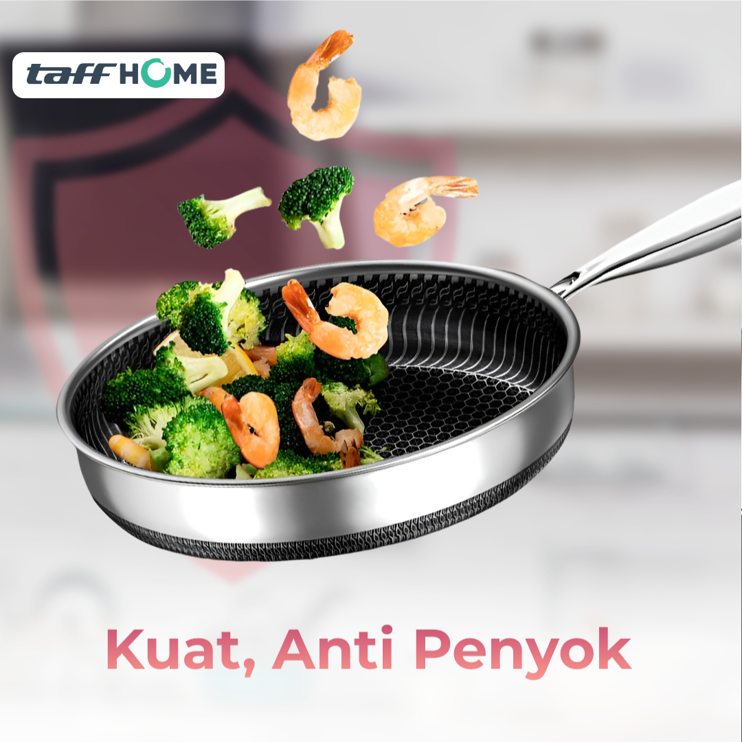 Nikmati pengalaman memasak yang lebih cepat, praktis, dan nyaman dengan wajan penggorengan dari TaffHOME. Produk ini dirancang untuk membantu Anda menghasilkan masakan lezat tanpa repot menghadapi makanan yang lengket atau sulit dibersihkan. Kombinasi material stainless steel 316 dan lapisan PTFE memberikan daya tahan tinggi sekaligus menjaga kualitas masakan tetap optimal. Dengan desain modern bermotif honeycomb, wajan ini tidak hanya fungsional tetapi juga menambah kesan profesional di dapur Anda. Cocok digunakan untuk kebutuhan memasak harian hingga persiapan menu spesial keluarga.