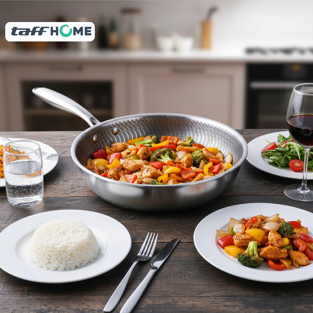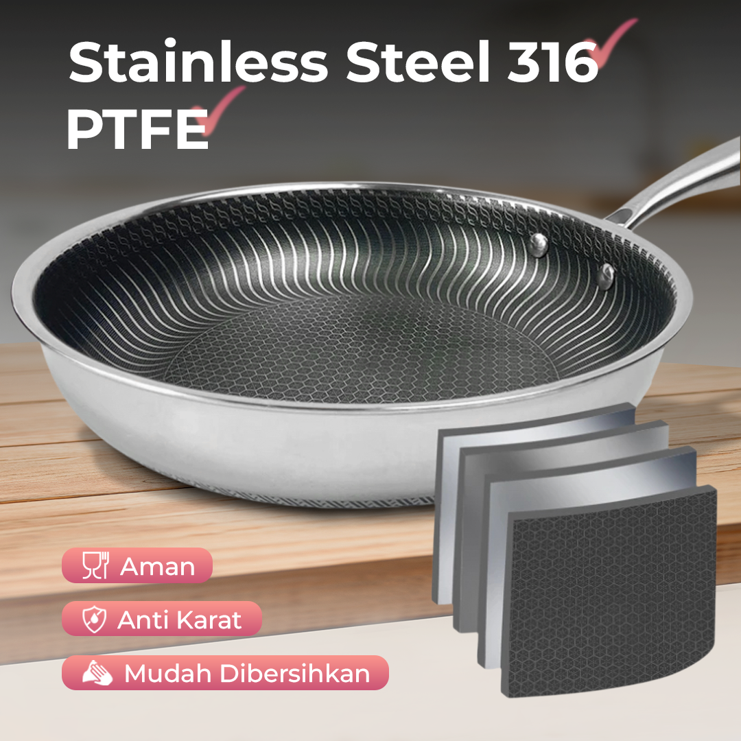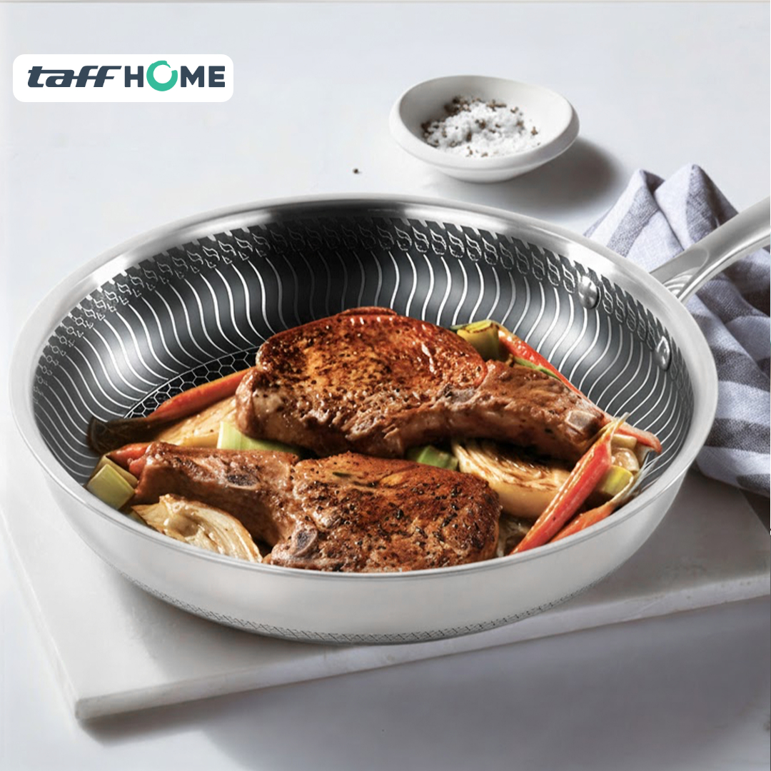 Nikmati pengalaman memasak yang lebih cepat, praktis, dan nyaman dengan wajan penggorengan dari TaffHOME. Produk ini dirancang untuk membantu Anda menghasilkan masakan lezat tanpa repot menghadapi makanan yang lengket atau sulit dibersihkan. Kombinasi material stainless steel 316 dan lapisan PTFE memberikan daya tahan tinggi sekaligus menjaga kualitas masakan tetap optimal. Dengan desain modern bermotif honeycomb, wajan ini tidak hanya fungsional tetapi juga menambah kesan profesional di dapur Anda. Cocok digunakan untuk kebutuhan memasak harian hingga persiapan menu spesial keluarga.