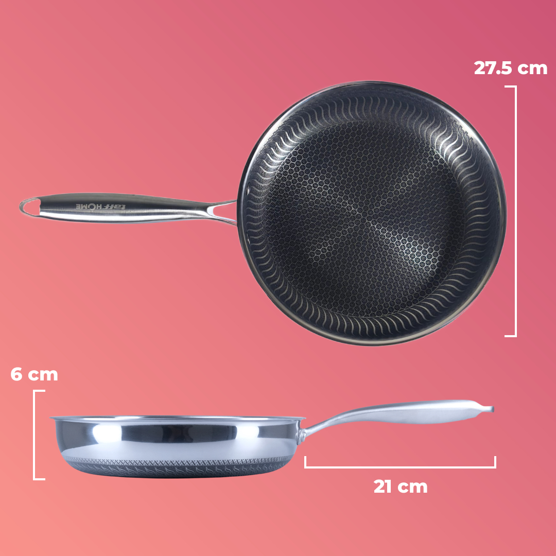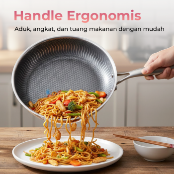 | Desain Honeycomb untuk Distribusi Panas Merata Motif honeycomb pada permukaan wajan membantu mendistribusikan panas secara lebih merata ke seluruh bagian. Hal ini membuat makanan matang sempurna tanpa bagian yang gosong atau kurang matang. Hasil masakan menjadi lebih konsisten dan tampak lebih profesional. |