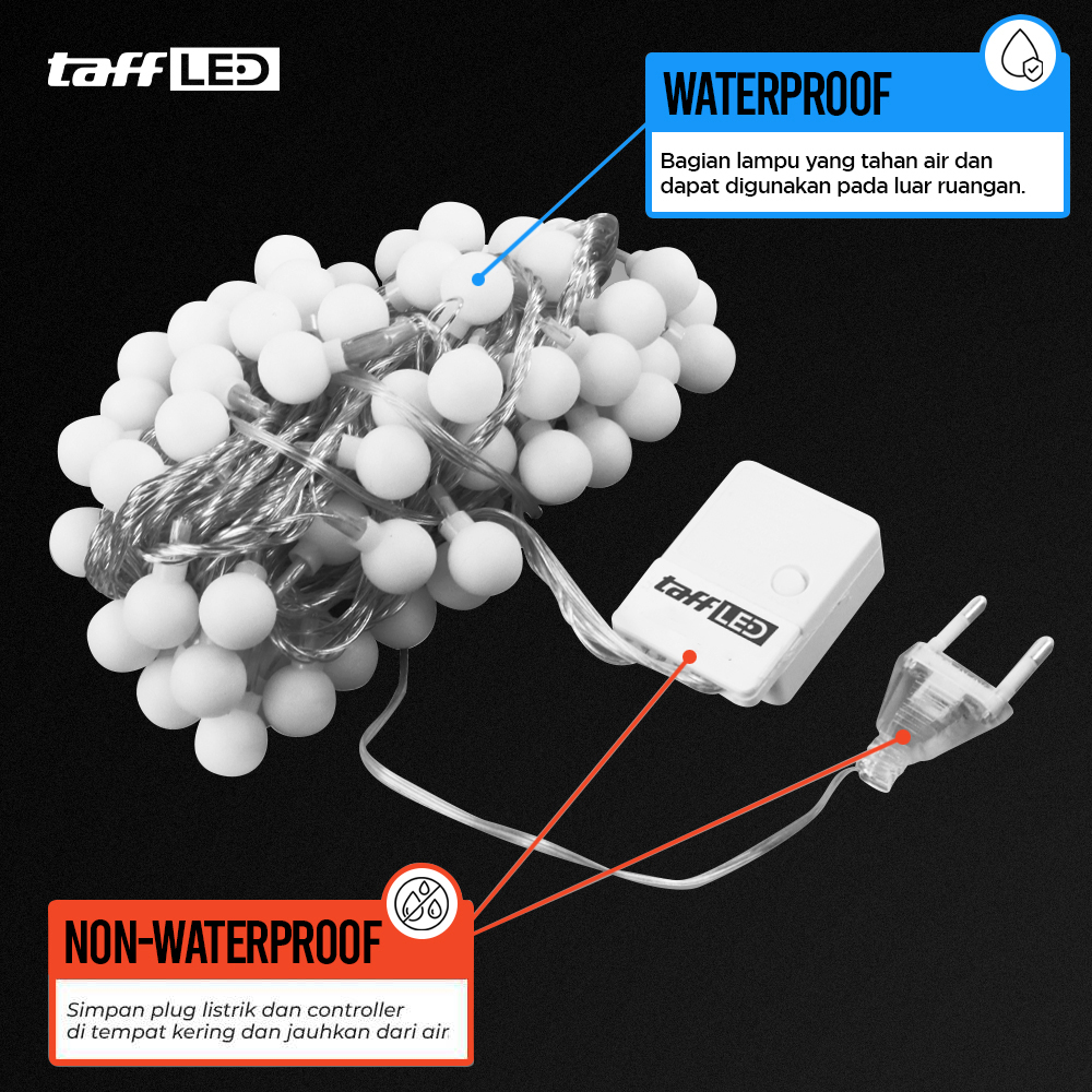 | Cocok untuk Penggunaan Indoor dan Outdoor Dilengkapi sealing waterproof pada bagian lampu LED, string lights ini aman digunakan di luar ruangan seperti taman, teras, atau balkon. Namun, bagian plug listrik tidak tahan air, sehingga pastikan colokan ditempatkan di area yang terlindung dari hujan atau percikan air.