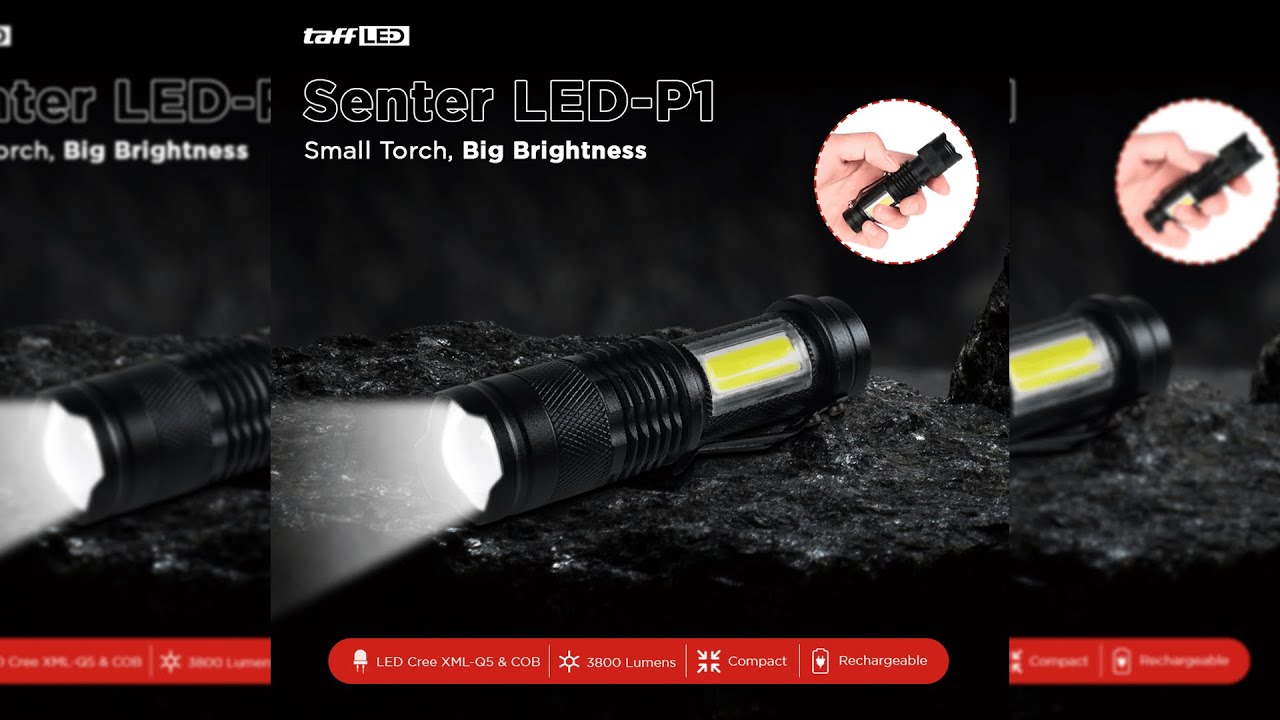 Beraktivitas di malam hari atau area yang gelap tetap aman dengan senter LED dari TaffLED. Menggunakan chip LED Cree XML-Q5 dan COB, senter ini dapat menghasilkan cahaya super terang. Diameter senter yang besar juga membuat area penerangan senter lebih luas dari senter biasa. Semakin lengkap dengan baterai rechargeable yang dapat diisi ulang saat dayanya habis.