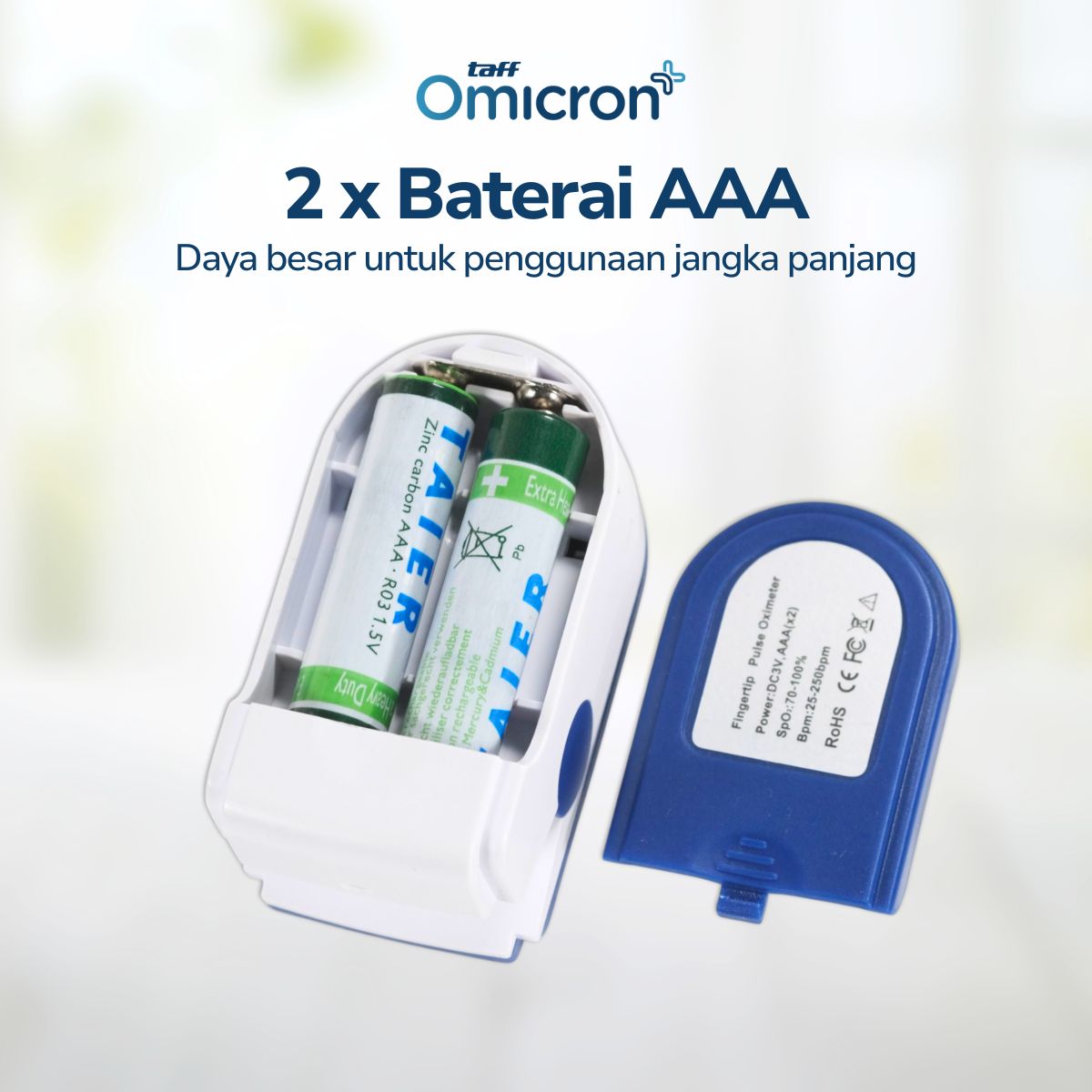| Daya Besar dan Tahan Lama Menggunakan baterai AAA, Anda dapat menggunakan pulse oximeter ini kapan saja. Tak perlu repot mencari stop kontak untuk mengisi ulang daya karena baterai bisa bertahan hingga hitungan bulan. |