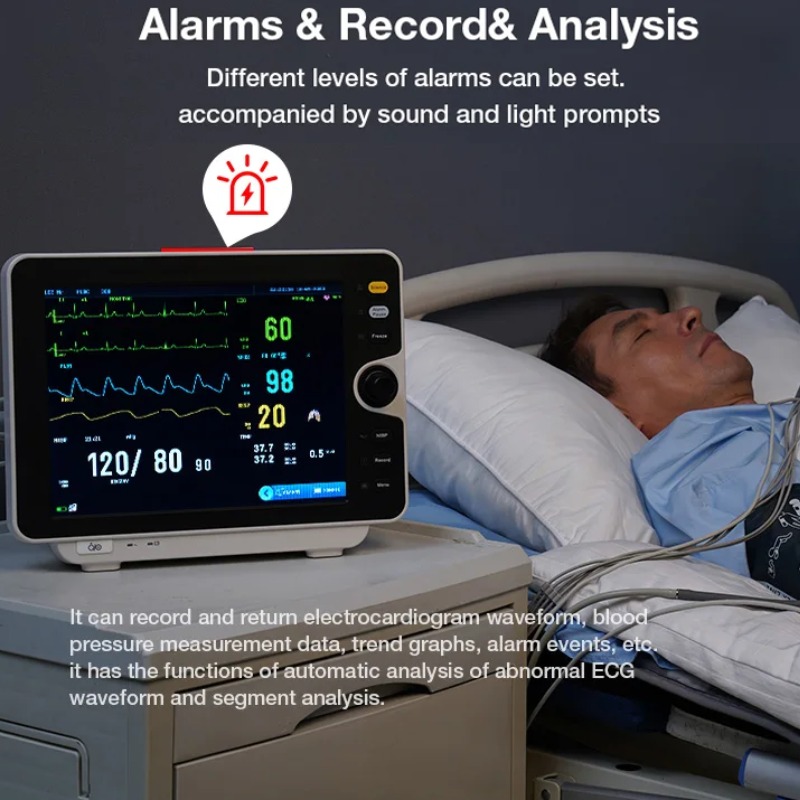 | Alarm Multilevel Prioritas Klinis Monitor pasien dilengkapi sistem alarm fisiologis dan teknis dengan tiga tingkat prioritas (High, Medium, Low), disertai LED indikator visual dan audio berbeda untuk masing-masing kategori. Alarm limit dapat dikustomisasi sesuai kondisi pasien (dewasa, pediatrik, neonatal). Tersedia fungsi alarm pause 1-3 menit, latch-up, dan alarm recall untuk meninjau kejadian sebelumnya. |