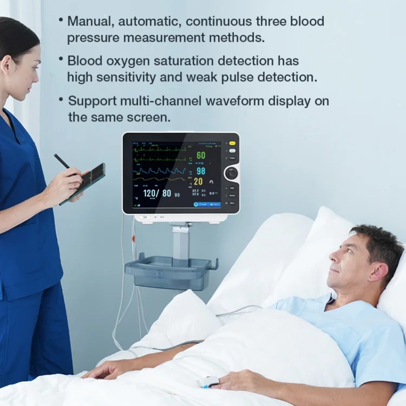 | Multiwaveform Display 12.1 Inch Monitor dilengkapi layar sentuh 12. Inch true color dengan sudut pandang luas dan brightness tinggi untuk visibilitas optimal di berbagai kondisi pencahayaan klinis. Sistem menampilkan multi-waveform secara simultan (ECG, plethysmograph, respirasi) dengan numeric parameter yang terkalibrasi jelas, membantu tenaga medis mengidentifikasi perubahan pola kondisi pasien secara cepat. |
