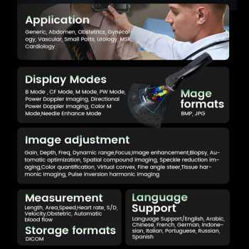 USG probe handheld yang satu ini dilengkapi dengan mode pencitraan lengkap seperti B Mode, M Mode, Color Flow Doppler, Power Doppler, Directional Power Doppler, hingga Pulse Wave Doppler dan Triplex Mode. Sistemnya mendukung konektivitas WiFi multi-platform (Android, iOS, Windows), DICOM storage & transfer, needle enhancement mode, serta proteksi IPX7 waterproof probe. Dengan baterai internal rechargeable dan wireless charging, USG digital ini mendukung mobilitas optimal untuk bedside examination, IGD, ICU, klinik, hingga tindakan intervensi.