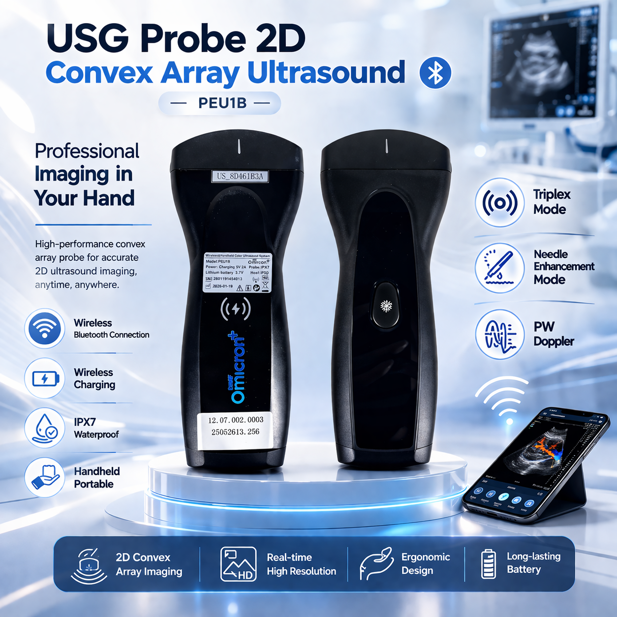 USG probe handheld yang satu ini dilengkapi dengan mode pencitraan lengkap seperti B Mode, M Mode, Color Flow Doppler, Power Doppler, Directional Power Doppler, hingga Pulse Wave Doppler dan Triplex Mode. Sistemnya mendukung konektivitas WiFi multi-platform (Android, iOS, Windows), DICOM storage & transfer, needle enhancement mode, serta proteksi IPX7 waterproof probe. Dengan baterai internal rechargeable dan wireless charging, USG digital ini mendukung mobilitas optimal untuk bedside examination, IGD, ICU, klinik, hingga tindakan intervensi.