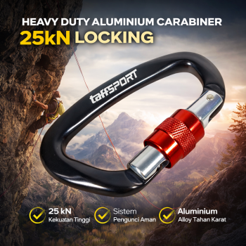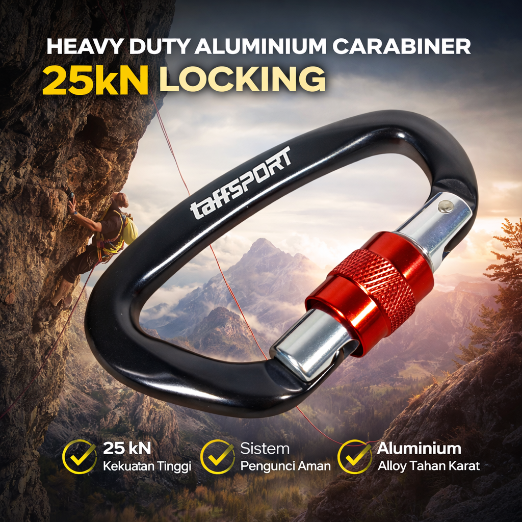 Karabiner aluminium 25kN dari TaffSPORT ini dirancang untuk kebutuhan outdoor dan panjat tebing dengan keamanan maksimal. Dilengkapi sistem locking kuat dan material aluminium alloy yang ringan serta tahan karat, produk ini mampu menahan beban berat hingga 25 kN. Cocok untuk climbing, camping, hingga penggunaan serbaguna sebagai alat pengait yang andal dan tahan lama.