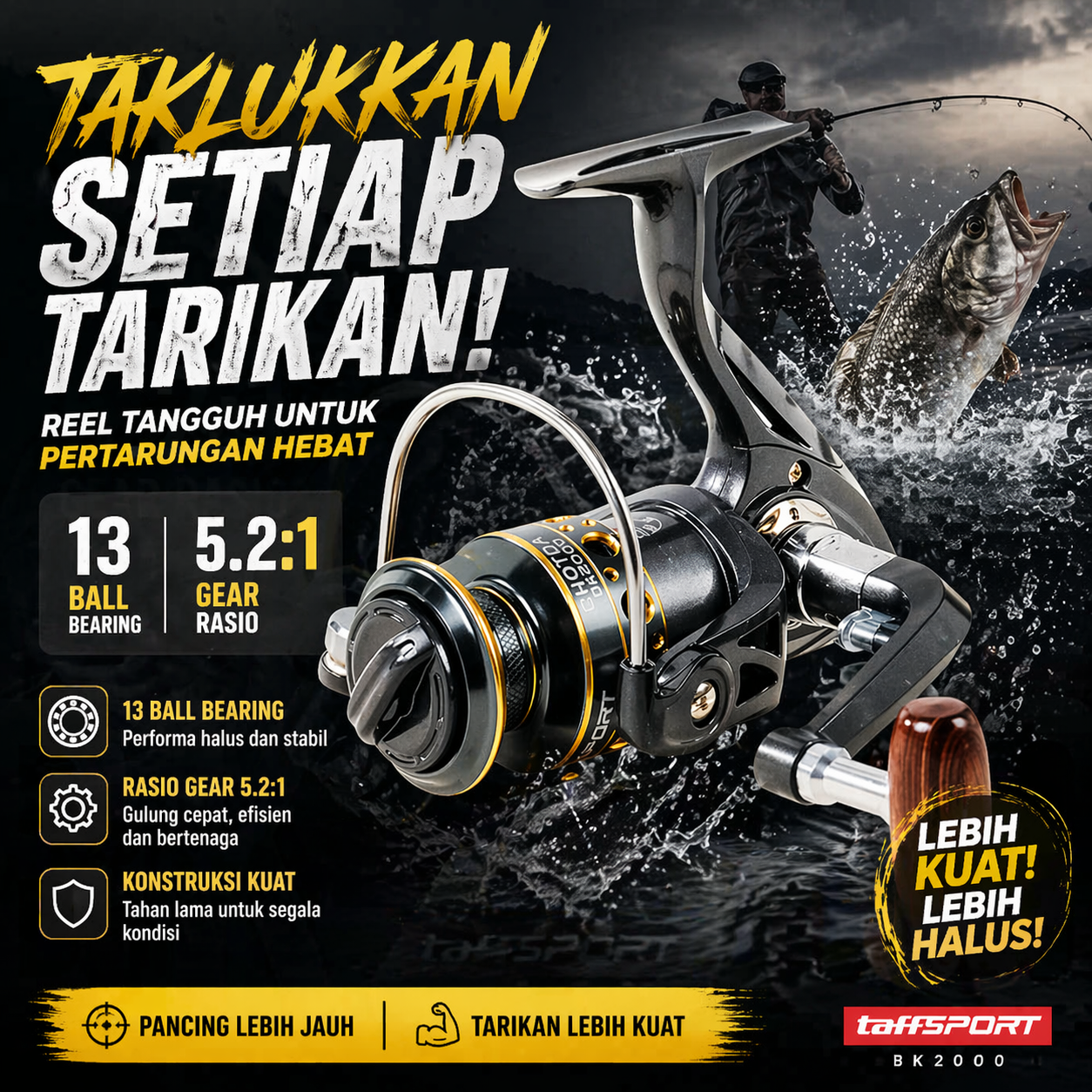 Sedang mencari reel pancing spinning yang halus, ringan, dan nyaman dipakai harian? TaffSPORT GHOTDA reel pancing hadir sebagai solusi untuk Anda yang membutuhkan fishing reel berkualitas dengan performa stabil. Dibekali 13 ball bearing, gear ratio 5.2:1, serta beban maksimal 12 kg, reel spinning ini cocok digunakan di sungai, danau, maupun laut dangkal. Pilihan tepat sebagai alat pancing andalan untuk berbagai spot favorit Anda.