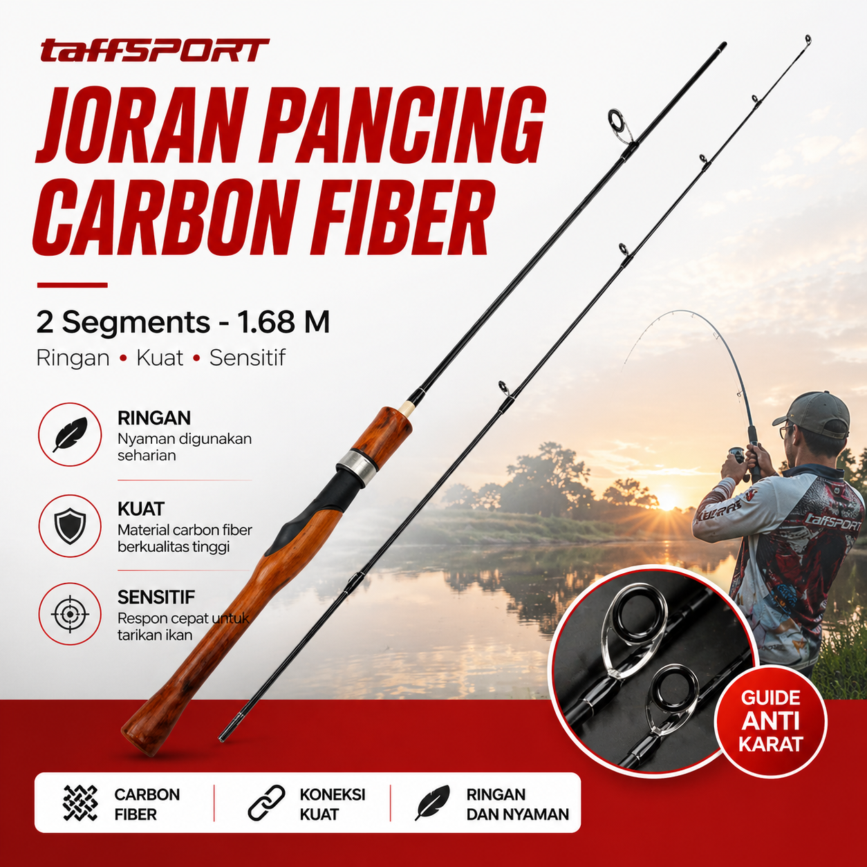 | Material Carbon Fiber Ringan dan Responsif Joran ini menggunakan material carbon fiber yang terkenal ringan namun tetap kuat. Bobot yang ringan membuat tangan tidak cepat lelah saat digunakan dalam waktu lama. Selain itu, material ini meningkatkan sensitivitas sehingga getaran kecil dari umpan bisa langsung terasa. Cocok untuk penggunaan joran spinning ringan. |