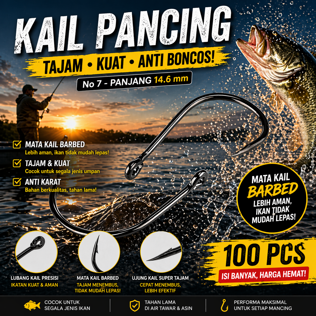 | Material Carbon Steel Kuat Terbuat dari baja karbon berkualitas yang terkenal kuat dan tidak mudah patah. Material ini sanggup menahan tarikan ikan dalam berbagai kondisi pemancingan. Cocok digunakan berulang kali untuk kebutuhan harian. Kail pancing terasa lebih kokoh dan awet. |