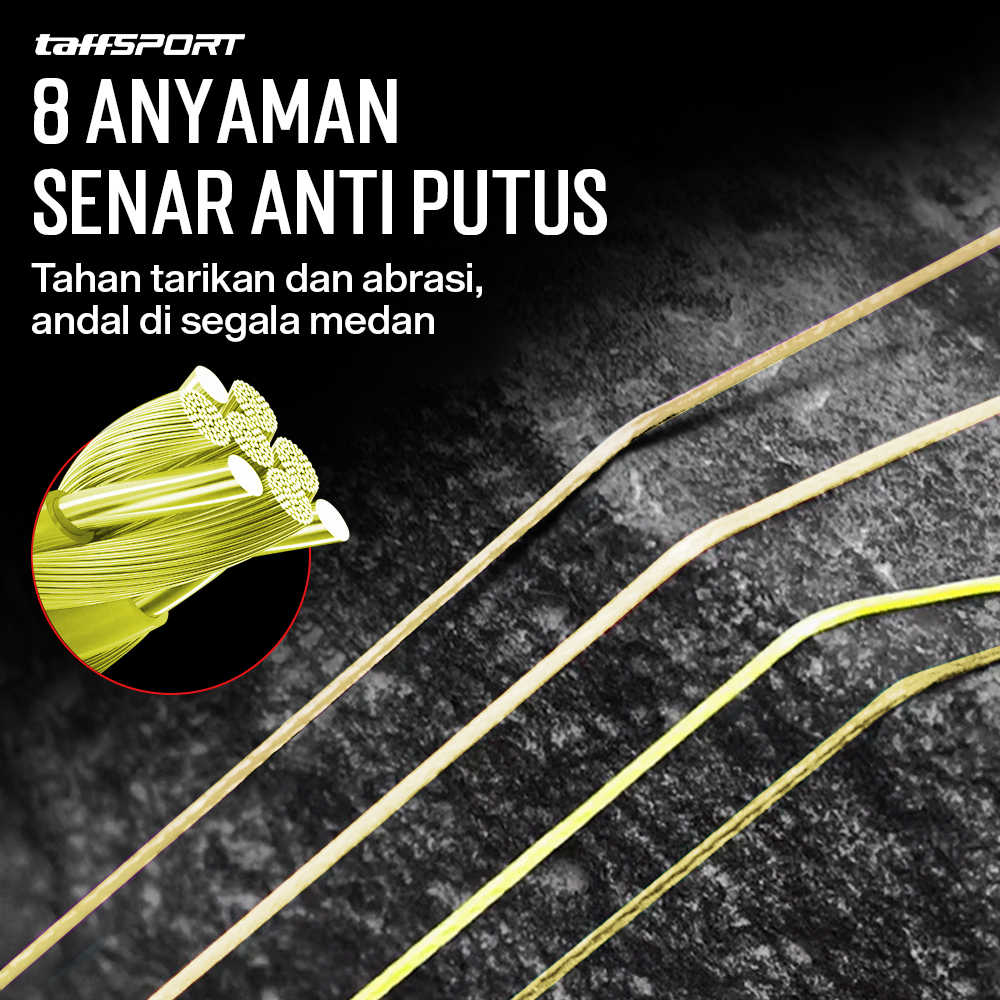 Struktur anyaman PE 8 serat yang rapat memiliki kekuatan yang jauh di atas senar konvensional. Permukaannya yang halus bantu mengurangi gesekan pada cincin joran untuk memperpanjang usia peralatan pancing dan menjaga performa lemparan tetap optimal meski digunakan berulang kali.