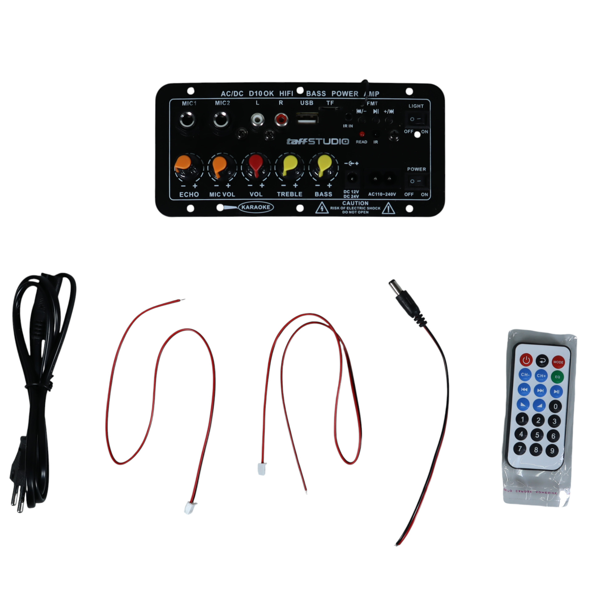 | Mudah Kontrol Output Suara Tidak hanya menghasilkan suara kualitas HiFi, amplifier board dari TaffSTUDIO juga memberikan kebebasan kontrol output suara melalui berbagai knob kontrol. Anda bisa mengatur efek suara yang dihasilkan dengan memutar knob echo, treble, bass, hingga volume. |