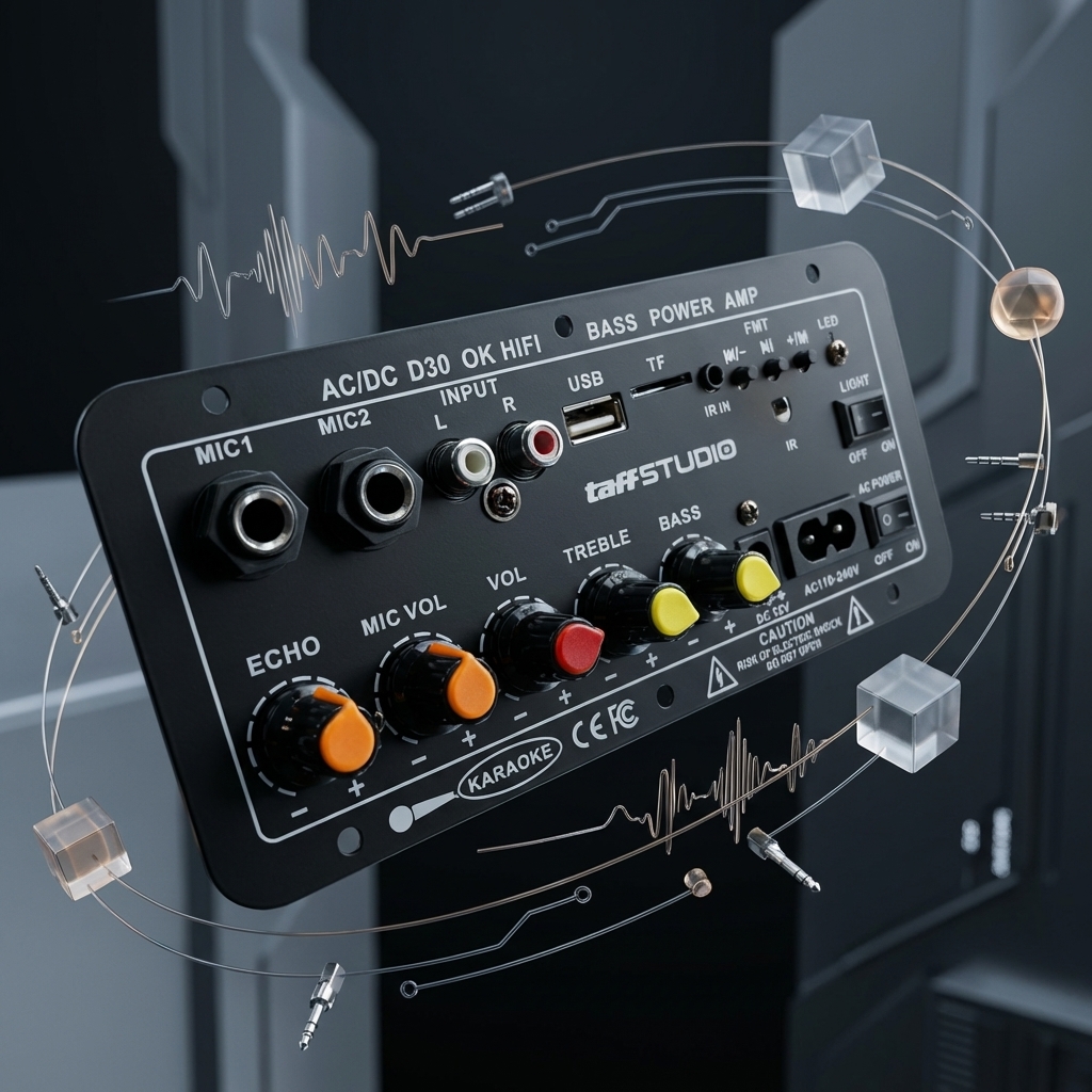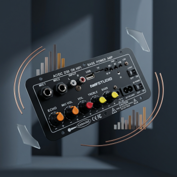 | Mudah Kontrol Output Suara Tidak hanya menghasilkan suara kualitas HiFi, amplifier board dari TaffSTUDIO juga memberikan kebebasan kontrol output suara melalui berbagai knob kontrol. Anda bisa mengatur efek suara yang dihasilkan dengan memutar knob echo, treble, bass, hingga volume. |