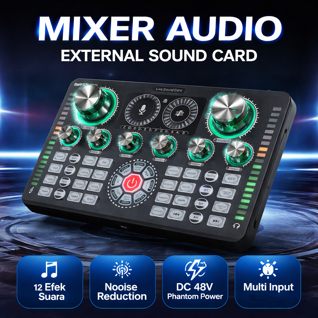 Ingin menghasilkan kualitas audio yang memuaskan saat live streaming hingga karaoke? Mixer audio external sound card Q7 dari TaffSTUDIO adalah solusinya. Dengan berbagai port input dan output, fitur noise reduction, serta efek suara, Anda bisa menghasilkan audio yang lebih berkualitas. Dibekali dengan port DC 48 V atau phantom power yang biasa digunakan pada peralatan audio profesional, seperti preamp atau kondenser.
