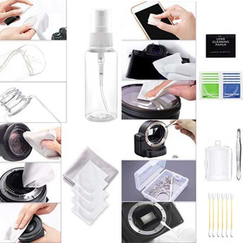 | Pembersih Sensor dan Alat Pembersih Lainnya Set ini juga dilengkapi dengan sensor cleaning swab, cotton swabs, dan lens cleaning tissue untuk membersihkan sensor kamera dan komponen-komponen kecil lainnya. Botol semprot yang bisa diisi cairan pembersih juga tersedia untuk membantu membersihkan lebih efektif. |