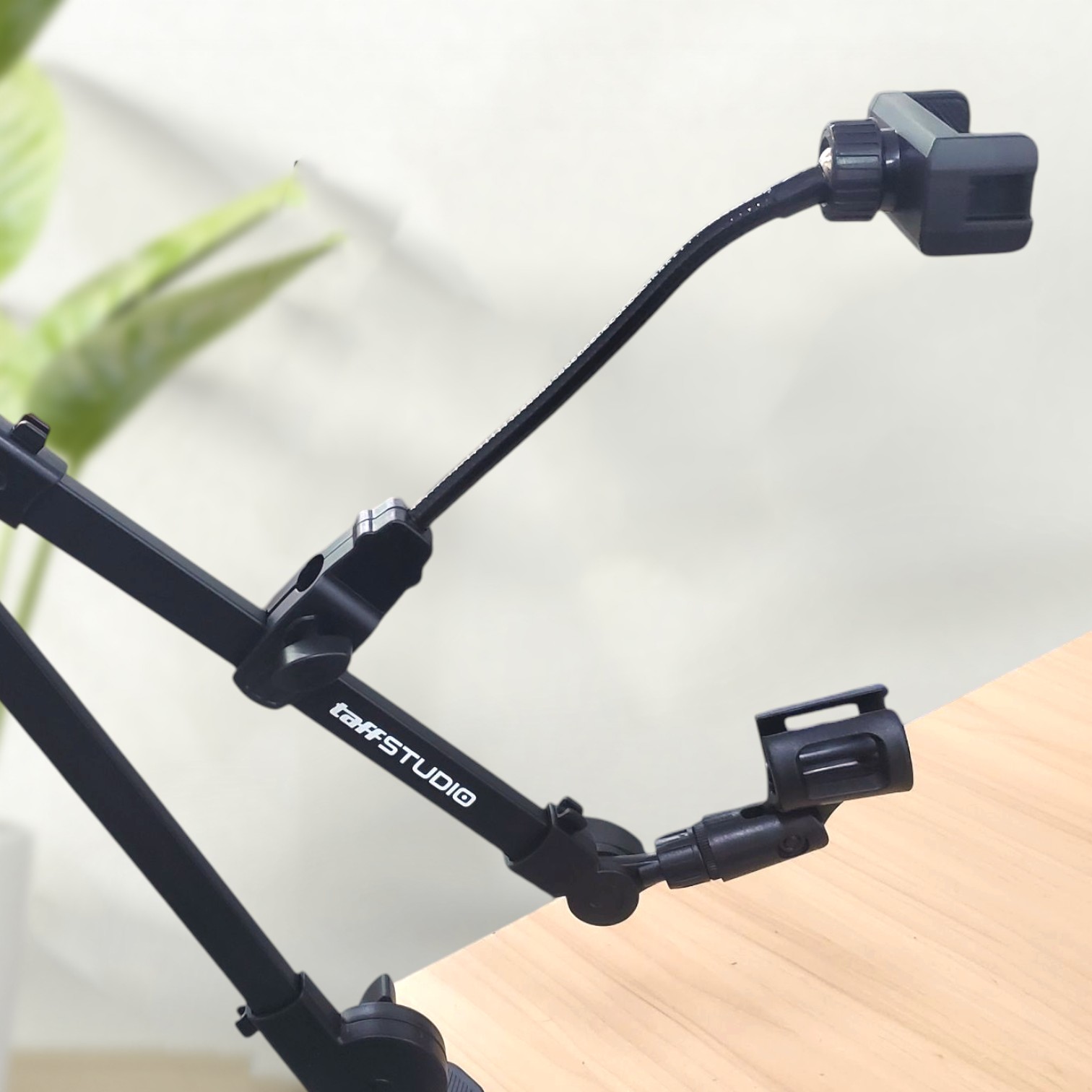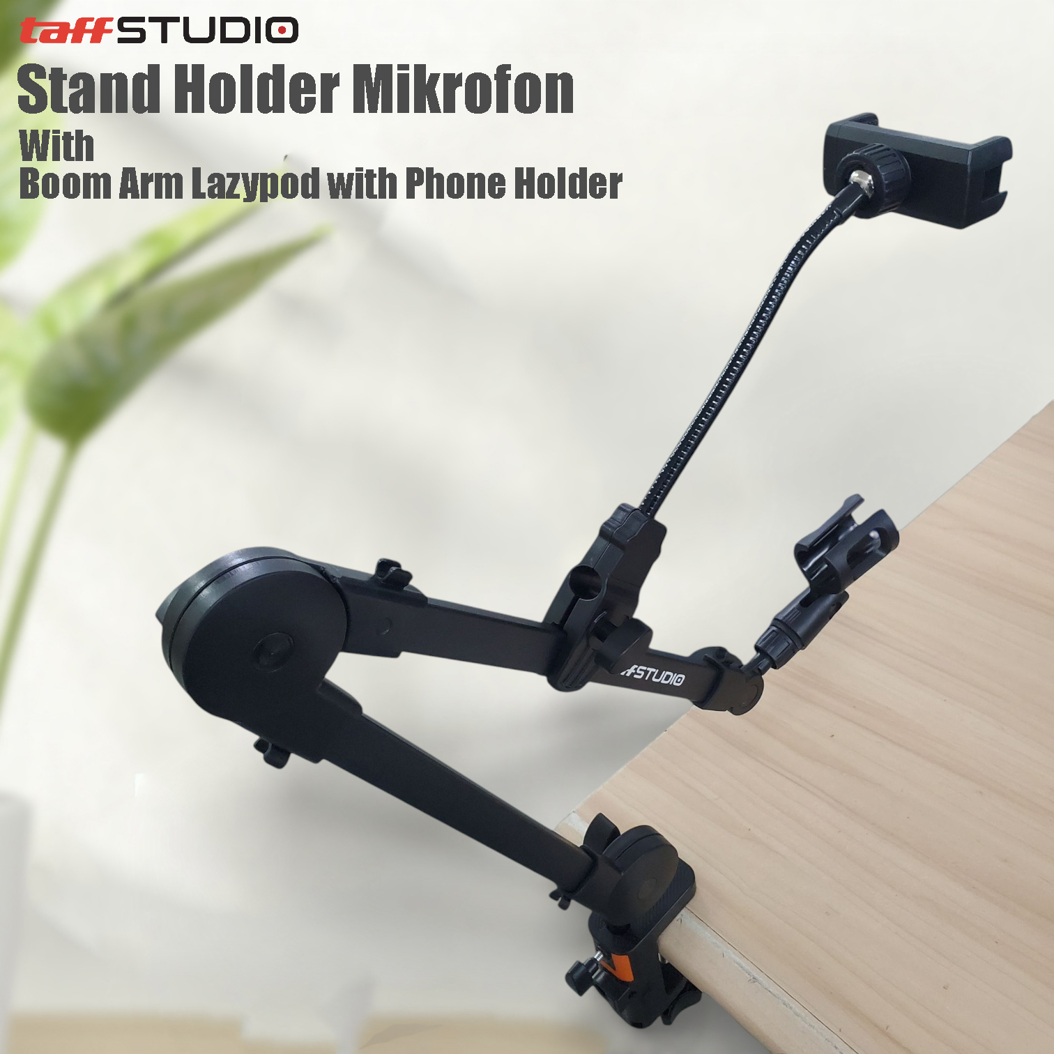 Holder mikrofon kondenser ini adalah pilihan tepat untuk Anda yang gemar merekam lagu, membuat podcast, atau sekadar bernyanyi. Dilengkapi dengan phone holder yang bisa diputar 360 derajat, Anda bisa dengan mudah melihat lirik, notasi musik, atau naskah tanpa mengganggu fokus saat rekaman.