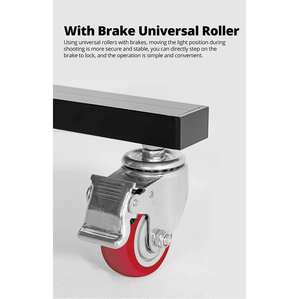| Roda untuk Mobilitas Tinggi Bagian kaki stand lampu dilengkapi roda halus yang memudahkan pemindahan posisi lampu tanpa perlu mengangkat stand. Ideal untuk studio indoor, workshop kreatif, atau ruang produksi yang membutuhkan perubahan lighting dengan cepat dan praktis. |