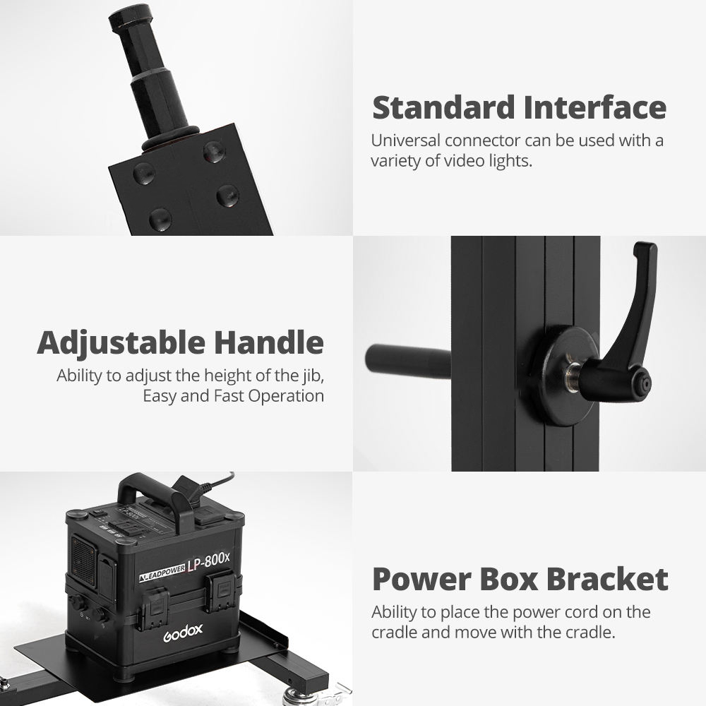 | Jaga Keseimbangan dan Stabilitas Dilengkapi dengan pemberat ganda untuk menjaga keseimbangan dan meningkatkan stabilitas saat boom arm menopang lampu atau aksesori yang berat di ujung lengan. Beban ini berfungsi sebagai penyeimbang agar boom arm tidak condong, turun, atau roboh ke satu sisi. Counterweight yang bisa digeser memungkinkan penyesuaian titik berat sesuai panjang boom dan berat lampu. |