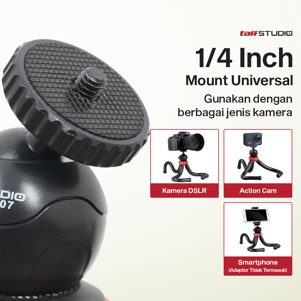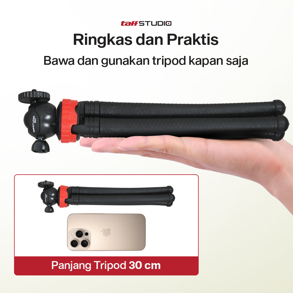 Abadikan momen spesial di mana saja kini lebih praktis dengan tripod kamera TaffSTUDIO. Menawarkan model gorilla dengan kaki fleksibel, Anda dapat membawa dan memasang tripod di berbagai tempat. Tinggi 30 cm pas untuk hasilkan berbagai angle dan mudah dibawa selama travelng. Atur posisi dan angle kamaera untuk tangkap berbagai momen dengan tripod kamera TaffSTUDIO!