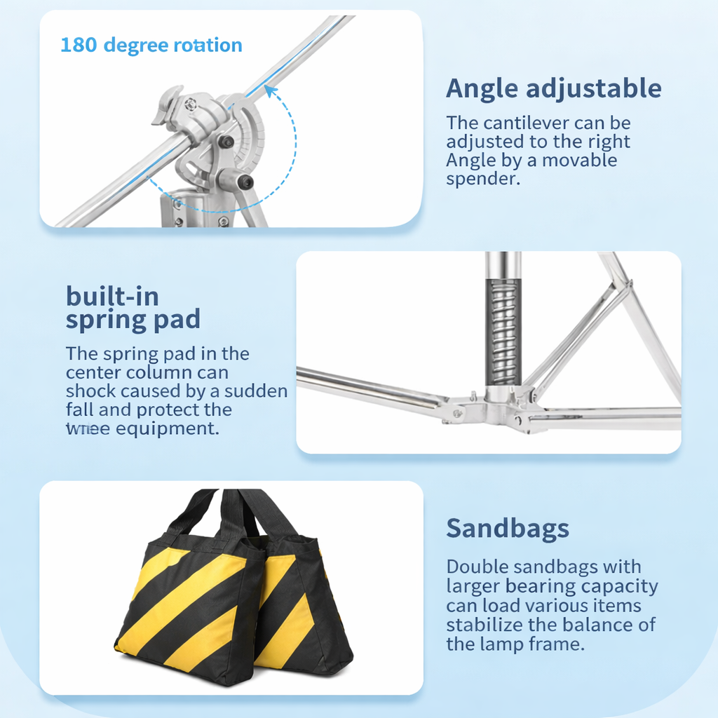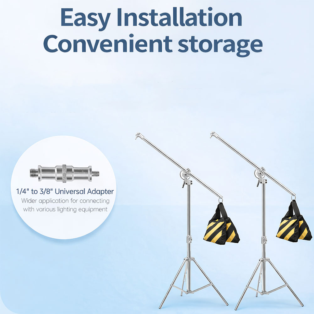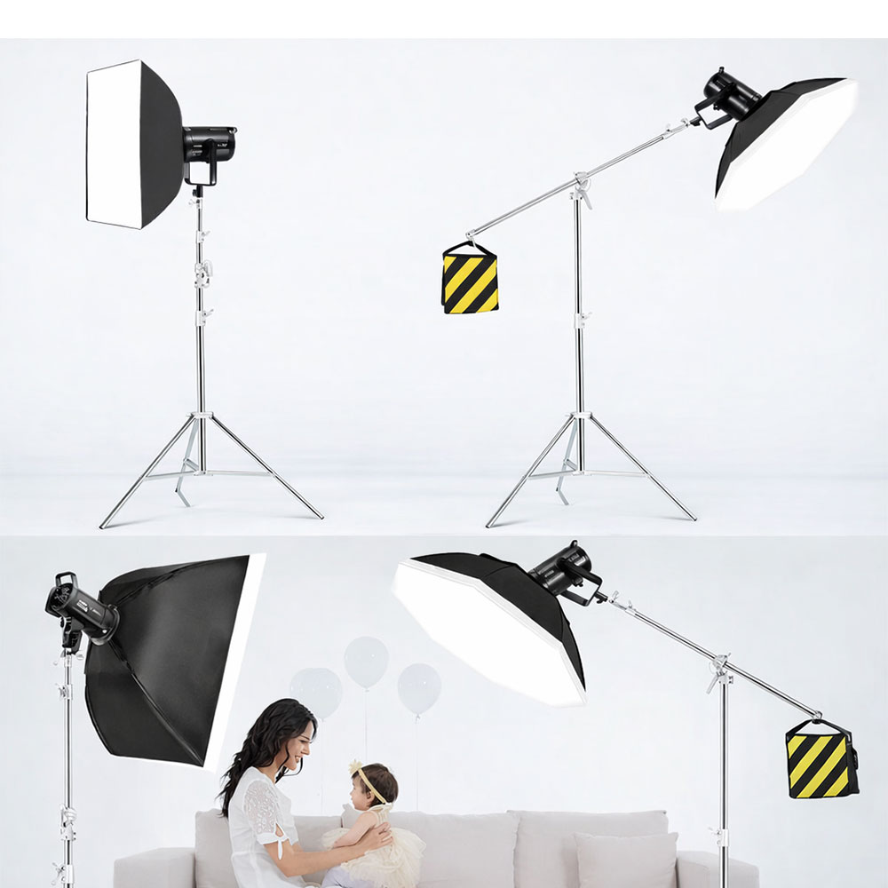 Tripod light stand profesional dari TaffSTUDIO. Tinggi maksimal 3.8 M dilengkapi boom arm teleskopik berbahan stainless steel dengan sistem cantilever, sandbag penyeimbang, stand ini ideal untuk kebutuhan fotografi dan videografi profesional. Tripod ini mampu menopang berbagai peralatan lighting seperti ring light, softbox, flash studio, reflector dengan stabil dan aman. Cocok untuk fotografer profesional hingga kebutuhan studio rumahan.