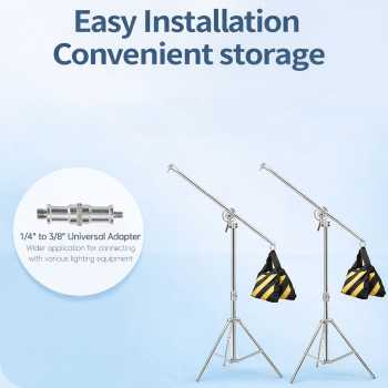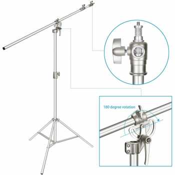 | Boom Arm Teleskopik Tripod ini dilengkapi crossbas atau boom arm teleskopik yang memiliki kontruksi pipa besi tebal untuk menjaga kestabilan saat digunakan vertikal maupun horizontal. Fitur ini membuat pemasangan lampu atau aksesoris dari arah atas (overhead lighting). Sangat membantu untuk setup flat lay photograpy, video top shot atau pencahayaan kreatif. |