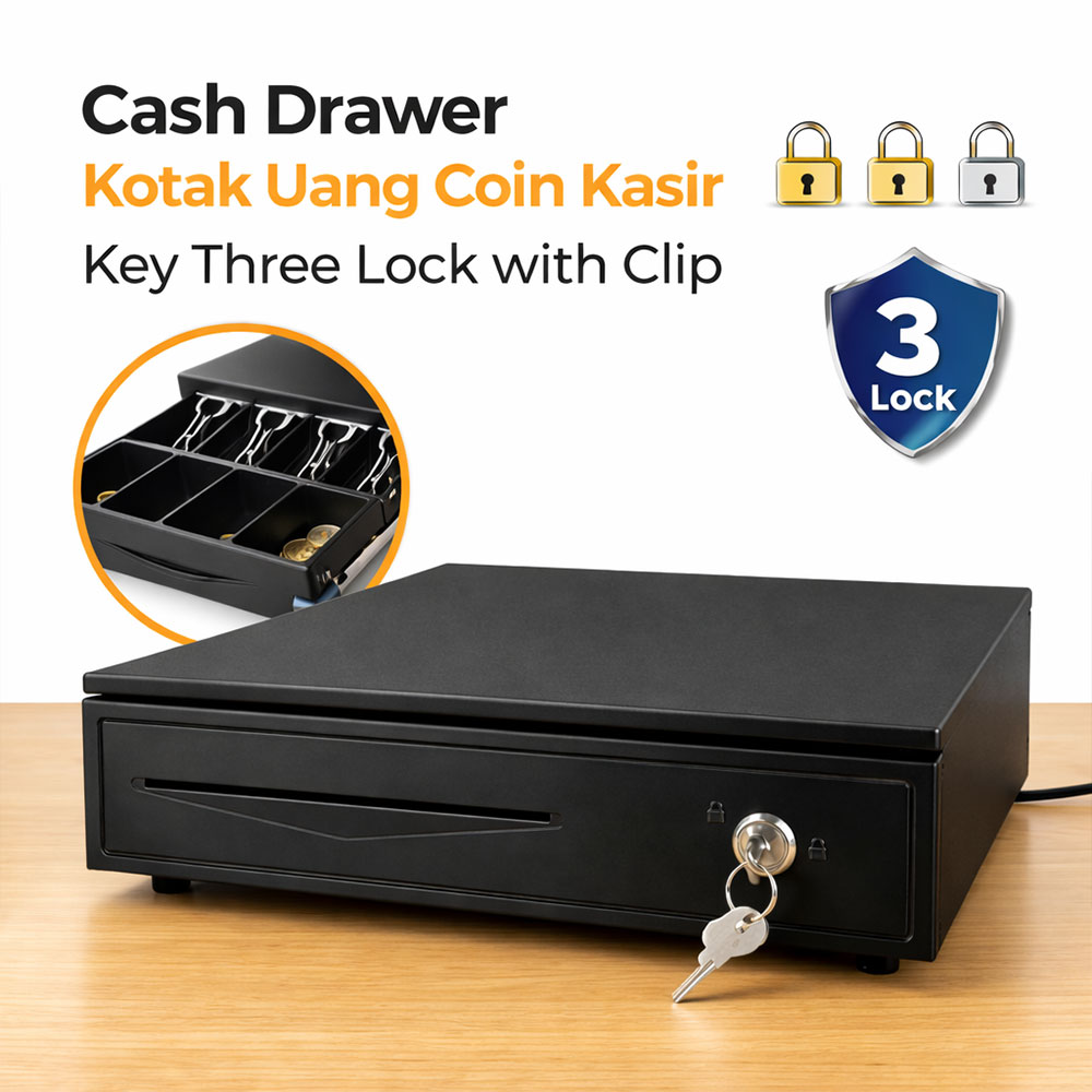 | Tersedia 2 Tipe 335 dan 405 Cash drawer coin ini hadir dalam dua pilihan kapasitas. Tipe 335 berukuran 37 x 33 x 8 cm dengan 4 slot uang kertas dan 3 slot koin, ideal untuk counter kasir yang lebih ringkas seperti kafe, booth, atau warung. Tipe 405 berukuran 42 x 40 x 10 cm dengan 5 slot uang kertas dan 5 slot koin, cocok untuk toko, minimarket, atau supermarket dengan volume transaksi lebih tinggi. Keduanya dilengkapi 2 kunci sehingga bisa dibuka manual saat dibutuhkan. |