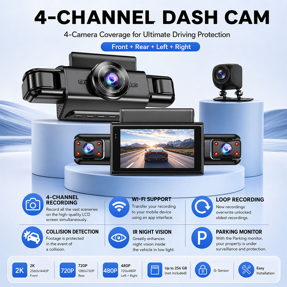 Taffware dashcam 4 camera menghadirkan rekaman perjalanan dari semua sudut kendaraan dalam satu perangkat. Dilengkapi kamera depan 2K, belakang 720P, dan dua kamera sisi 480P, dashcam ini merekam secara bersamaan dengan koneksi WiFi 2.4 GHz yang memudahkan monitoring langsung dari smartphone. G-Sensor 3 axis dan loop recording otomatis menjadikannya solusi lengkap untuk kebutuhan rekaman bukti perjalanan, keamanan parkir, hingga kendaraan operasional.