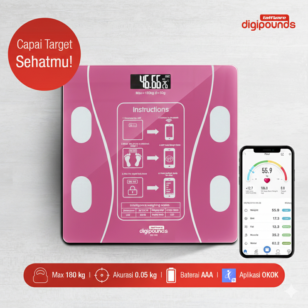 Timbangan digital modern dengan layar LCD jelas, sensor presisi, dan fitur pengukur suhu ruangan. Desain kaca tempered elegan, kuat, dan aman digunakan. Terhubung ke aplikasi via Bluetooth untuk memantau berat, BMI, lemak, otot, hingga kadar air. Praktis, minimalis, dan ideal bagi Anda yang ingin kontrol penuh atas kesehatan.